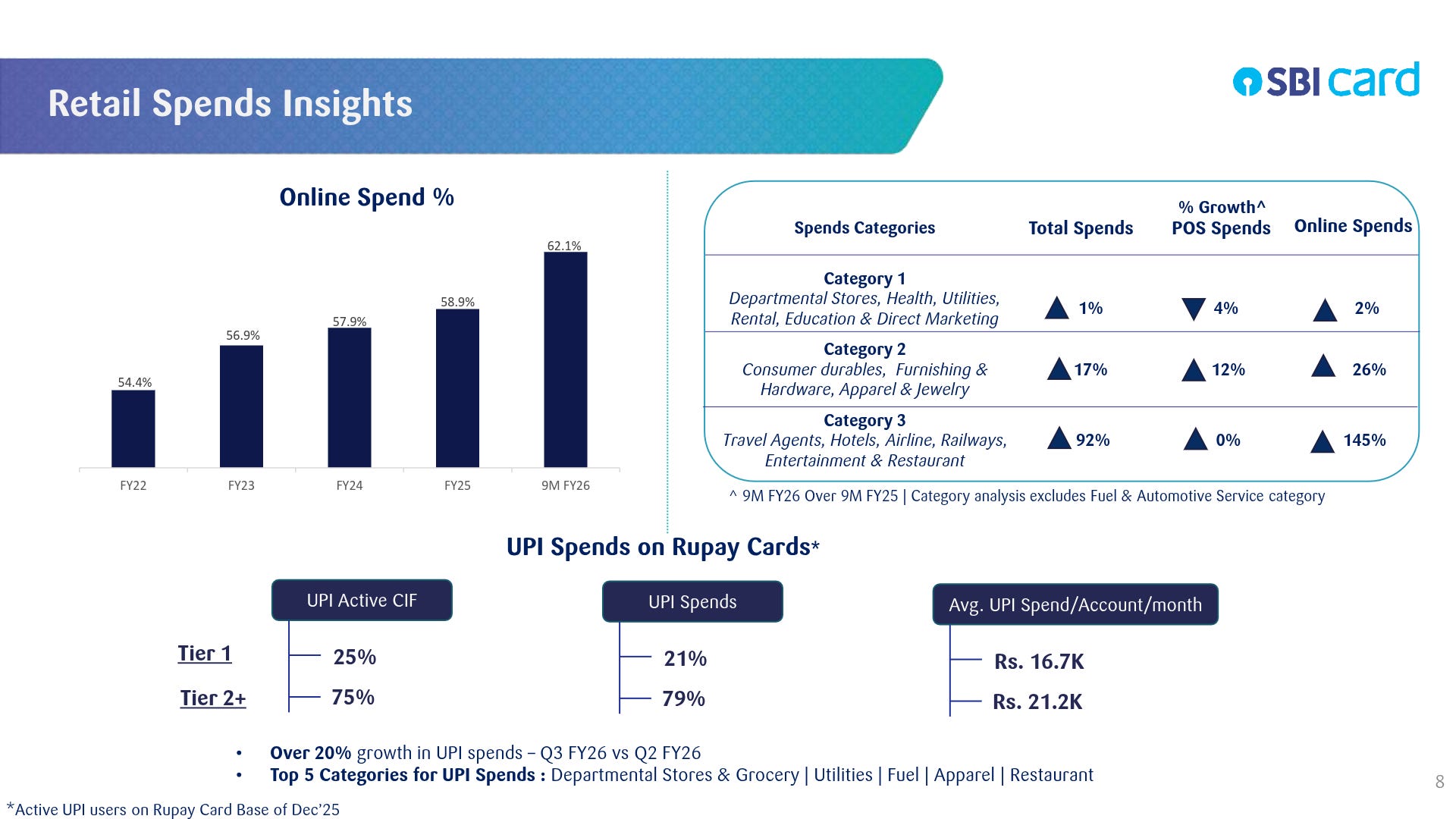 Rapid UPI spend growth on RuPay cards, especially in Tier 2+ cities, establishes a massive growth vector in small-ticket merchant payments. This expanded digital footprint creates an efficient acquisition funnel for higher-margin credit products.