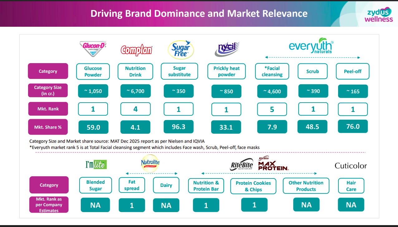 Zydus Wellness has built a diversified portfolio of category leaders—#1 positions in glucose, sugar substitutes, scrubs, and peel-offs. Personal care (Everyuth) is emerging as a high-growth adjacency alongside core nutrition brands.