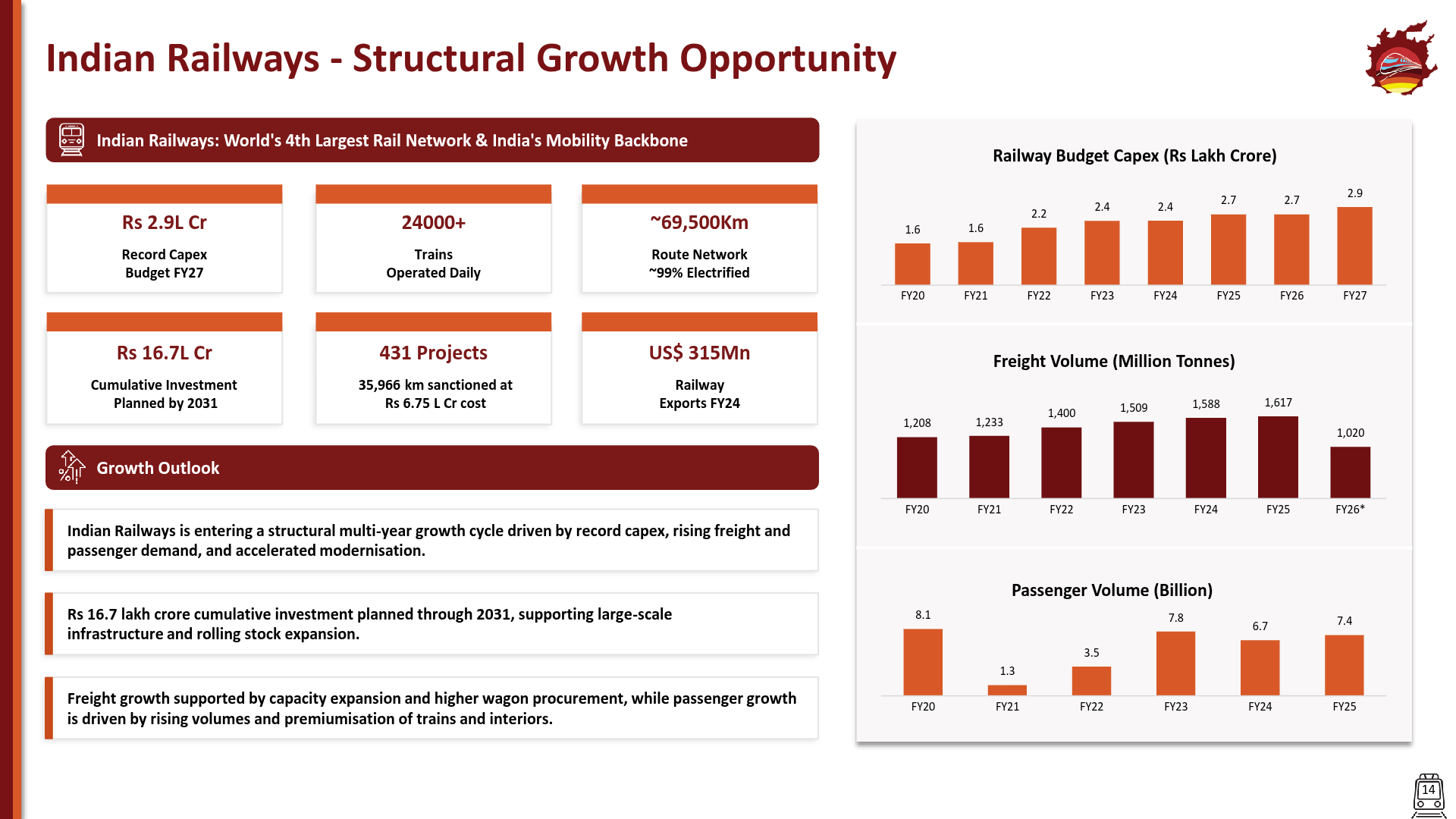A record ₹2.9 lakh crore railway budget for FY27 signals a multi-year commitment to modernization, providing long-term demand visibility. This structural growth supports more confident capacity expansion and capital allocation.
