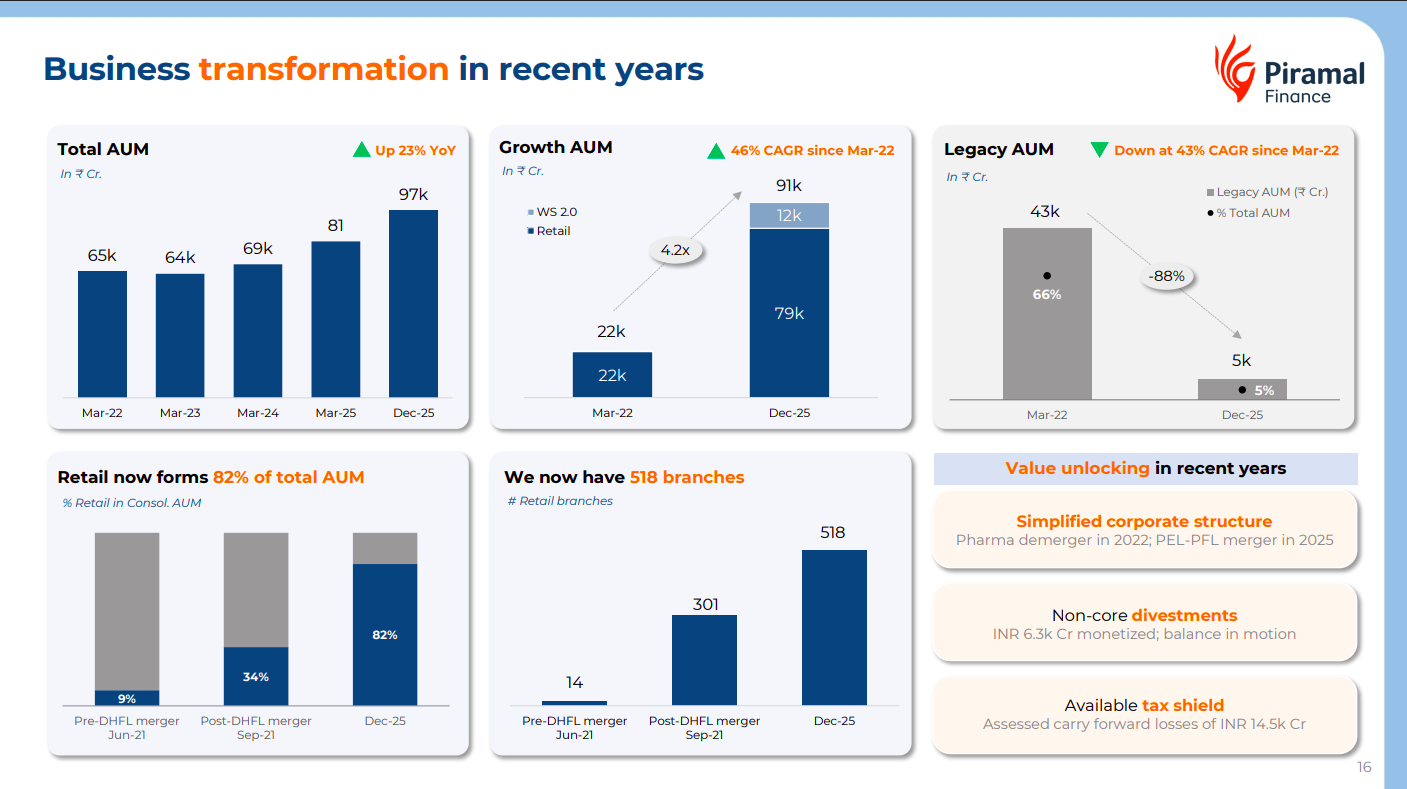 Piramal Finance has significantly transformed its portfolio, with total AUM rising to ₹97K crore (+23% YoY) while legacy AUM has sharply reduced. Retail lending now accounts for 82% of total AUM, supported by rapid branch expansion and strategic restructuring initiatives.