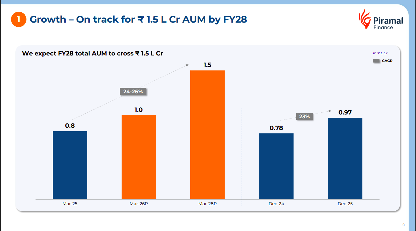 The company aims to reach ₹1.5 lakh crore AUM by FY28, implying a 24–26% CAGR from FY25 levels. Recent momentum shows AUM already growing 23% YoY, indicating the company is broadly on track to meet this growth target.