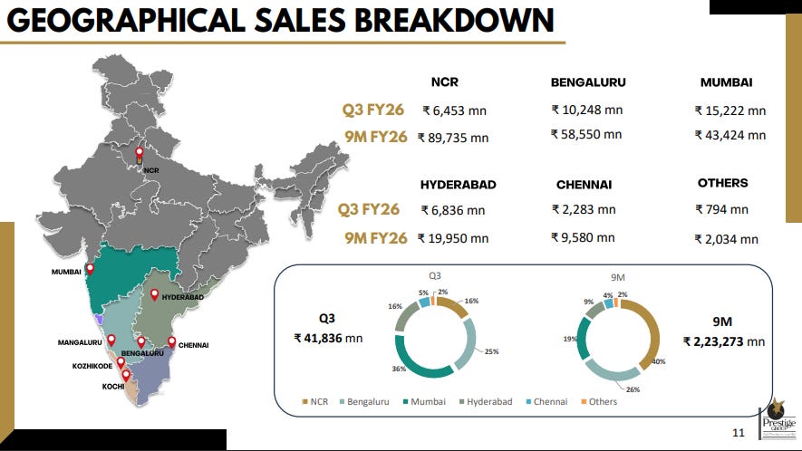 Sales are concentrated in Mumbai and Bengaluru, which together contribute the largest share across both Q3 and the nine-month period, with NCR also forming a meaningful portion. Other cities like Hyderabad and Chennai contribute moderately, while the rest remain a small part of the overall mix.