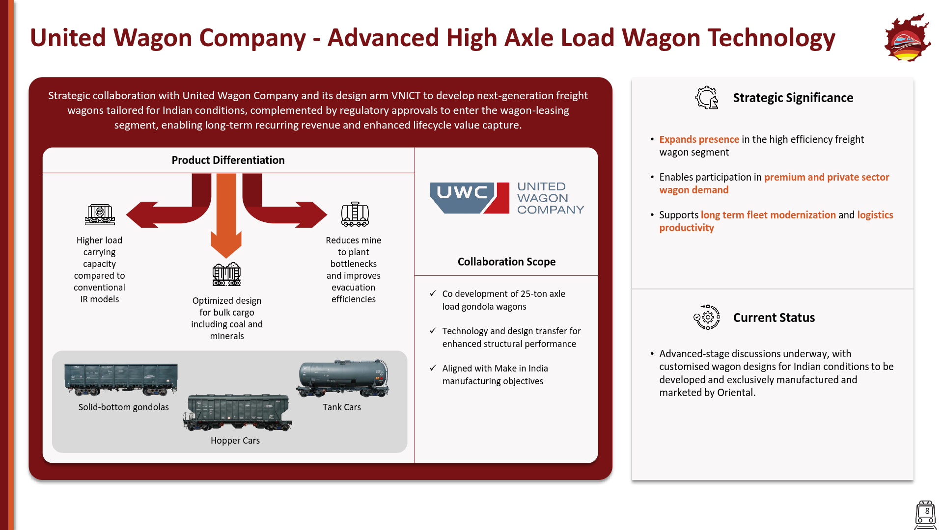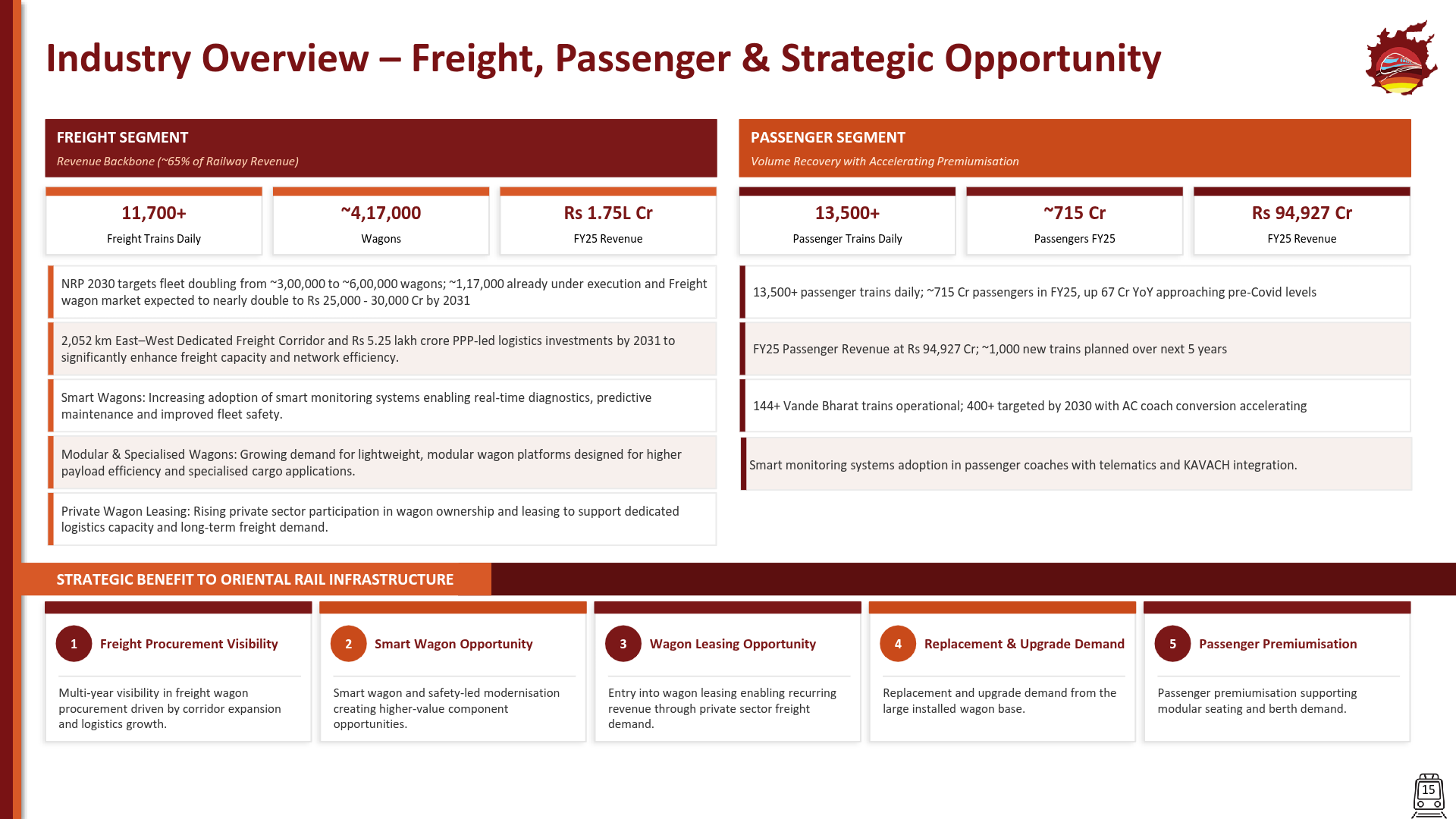 Oriental Rail Infrastructure manufactures rolling stock components, interiors, and freight wagons for Indian Railways and private logistics operators. The company is strategically transitioning into high-technology smart wagons and recurring-revenue leasing models to diversify its earnings profile.