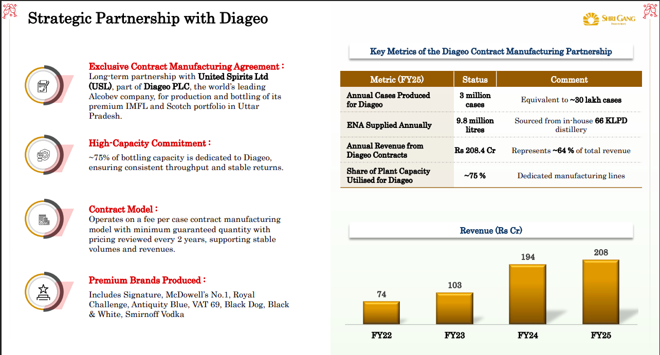Shri Gang Industries has a long-term, exclusive contract manufacturing tie-up with Diageo (USL), anchoring its business with stable, high-volume demand. ~75% of capacity is dedicated to Diageo, with a fee-based model and minimum guarantees, driving predictable revenues and strong utilization.