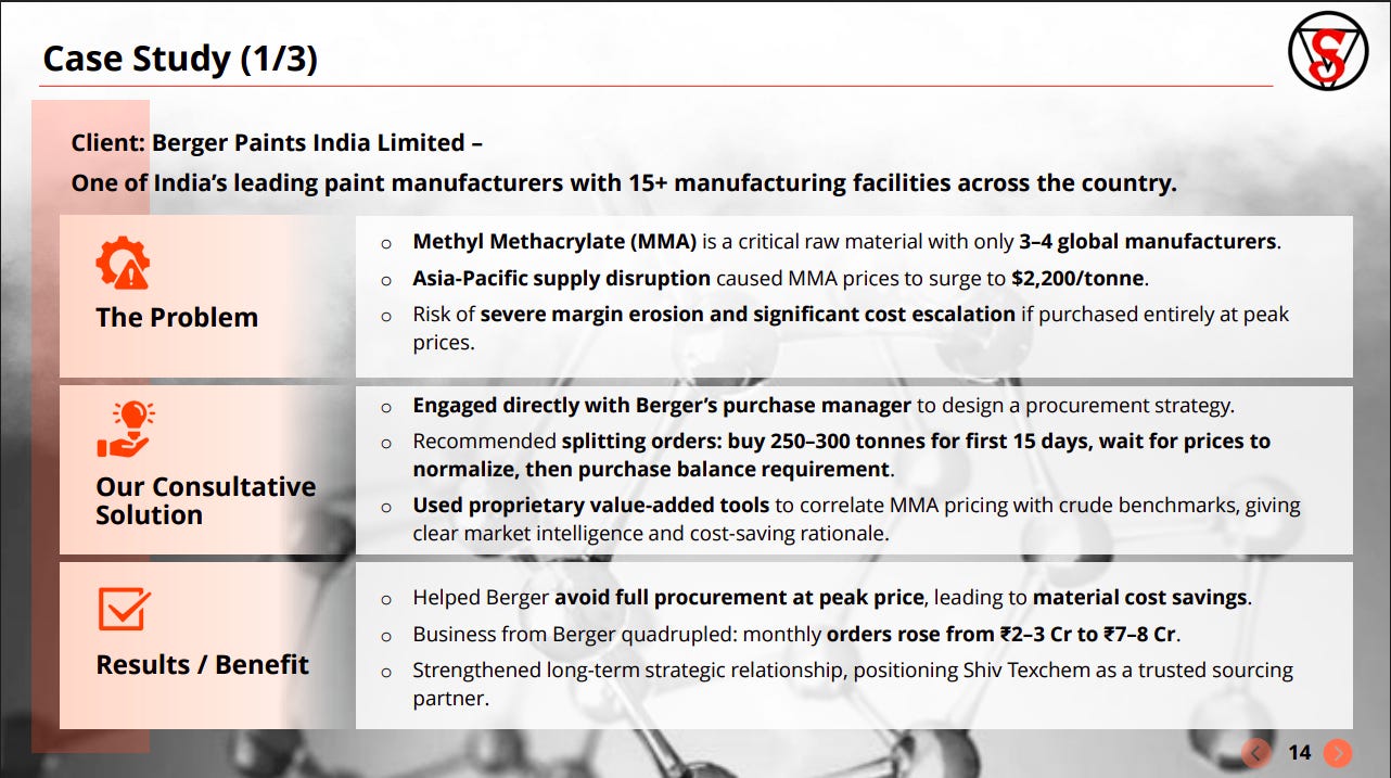 During a supply shock in MMA, Shiv Texchem’s procurement strategy (staggered buying + price benchmarking) helped Berger avoid peak pricing. This resulted in cost savings and a 3–4x scale-up in business volumes.