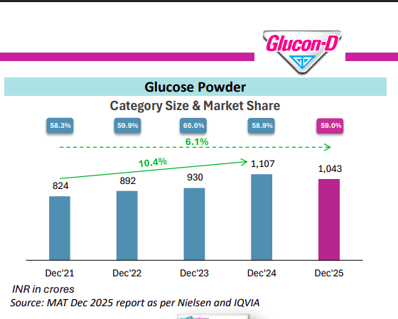 Glucon-D remains a dominant category leader (~59% share) in glucose powders, with steady category expansion (~6% growth). While growth moderated in FY25, leadership position remains intact.