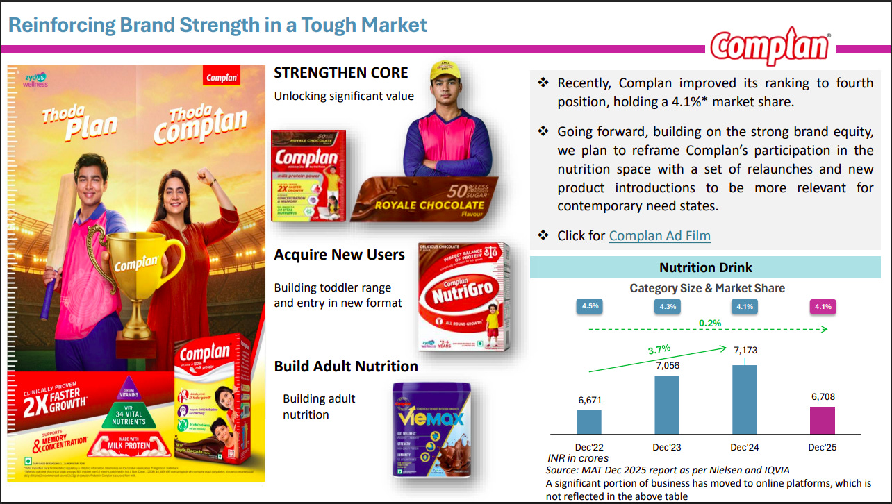 Complan is rebuilding relevance through a core refresh, new user acquisition (toddlers), and adult nutrition expansion. Despite a modest 4.1% market share, the brand is repositioning with relaunches to tap evolving nutrition needs.