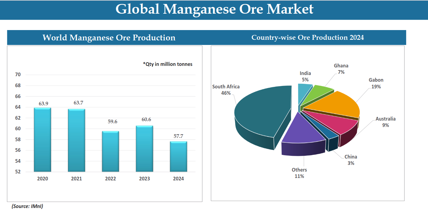 Global manganese supply is highly concentrated, with South Africa (~46%) and Gabon (~19%) dominating production, while India contributes only ~5%. This concentration creates supply-side risks and pricing power cycles globally.