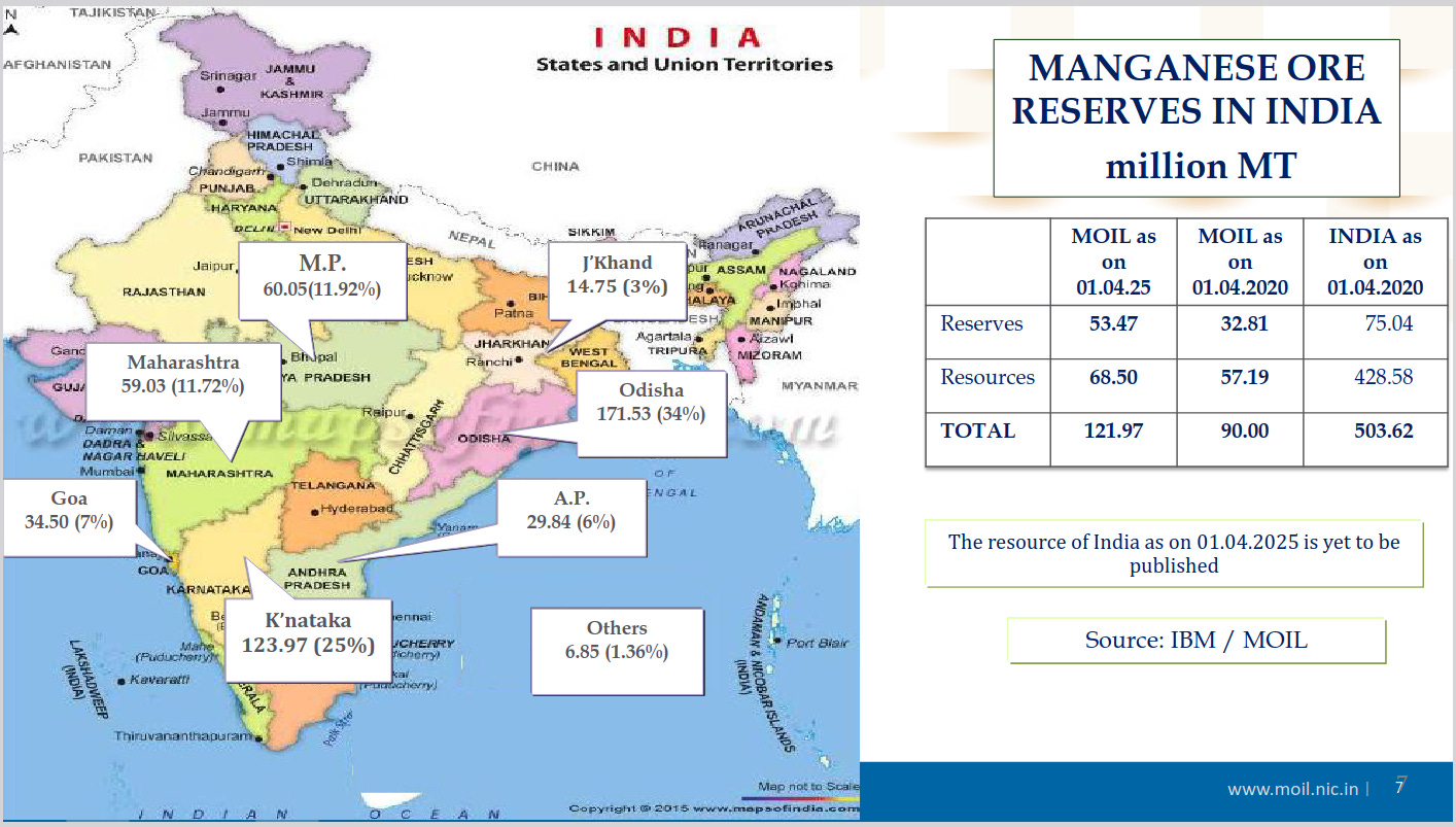 Manganese reserves are heavily concentrated in Odisha (~34%), Karnataka (~25%), and MP/Maharashtra (~12% each). MOIL has significantly expanded its reserve base, strengthening its strategic positioning in domestic supply.