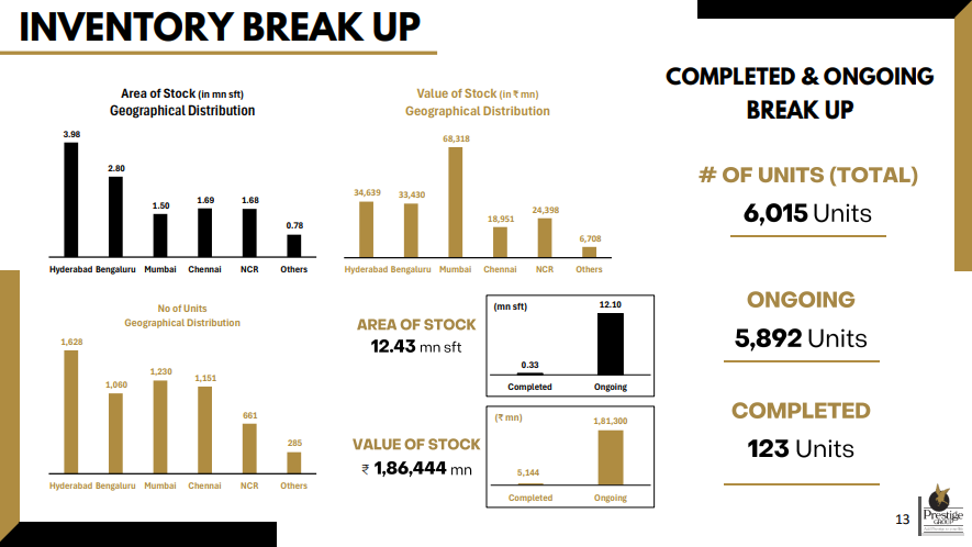 Inventory is largely concentrated in Hyderabad and Bengaluru by area, while Mumbai leads in value, with total inventory at 12.43 mn sq ft worth ₹1,86,444 mn. Most of this is tied to ongoing projects, with 5,892 out of 6,015 units still under development and only a small portion completed.
