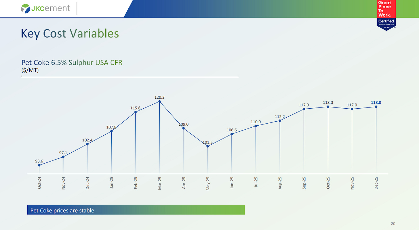 Pet coke prices—one of the key cost drivers for cement—have largely stabilised after earlier volatility, trending in a narrow range in recent months. This suggests cost pressures are easing, which should support margin recovery if pricing holds.