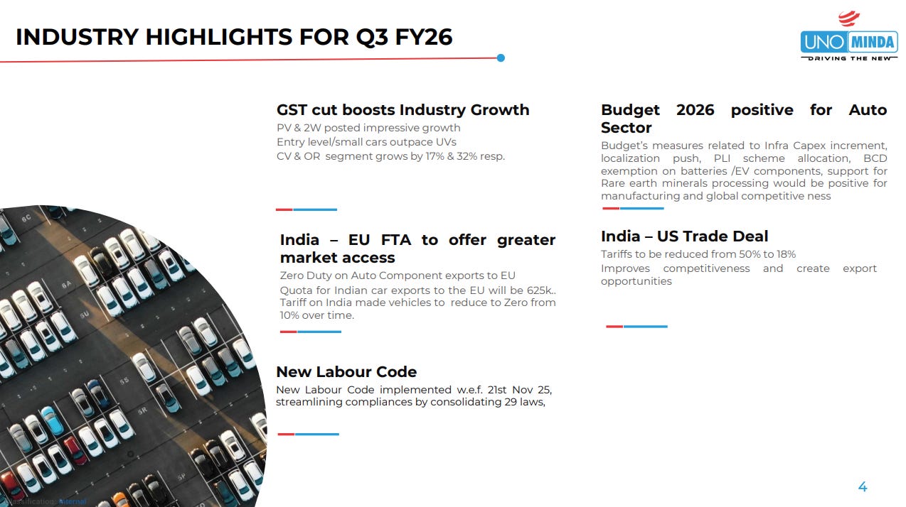 Multiple tailwinds are aligning for the auto sector—GST cuts and strong growth in PV/2W and CV segments are driving demand, while policy support through Budget 2026, PLI incentives, and localization pushes is strengthening the manufacturing ecosystem. At the same time, trade agreements with the EU and US are opening up export opportunities, even as regulatory changes like the new labour code aim to streamline operations, collectively creating a more supportive environment for sustained industry growth.