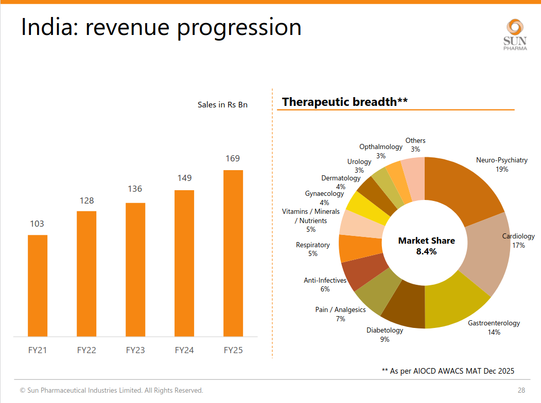 India revenues have shown consistent growth, supported by a diversified therapy mix and strong presence across chronic segments. Sun Pharma maintains leadership with ~8.4% market share, underpinned by broad therapeutic coverage.