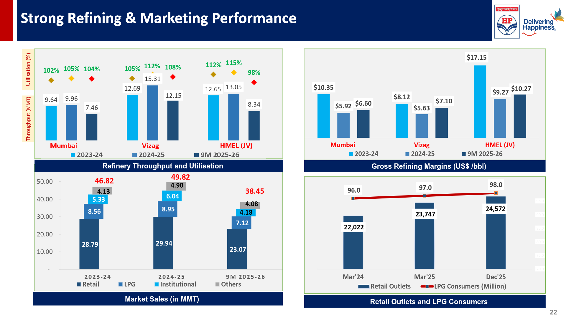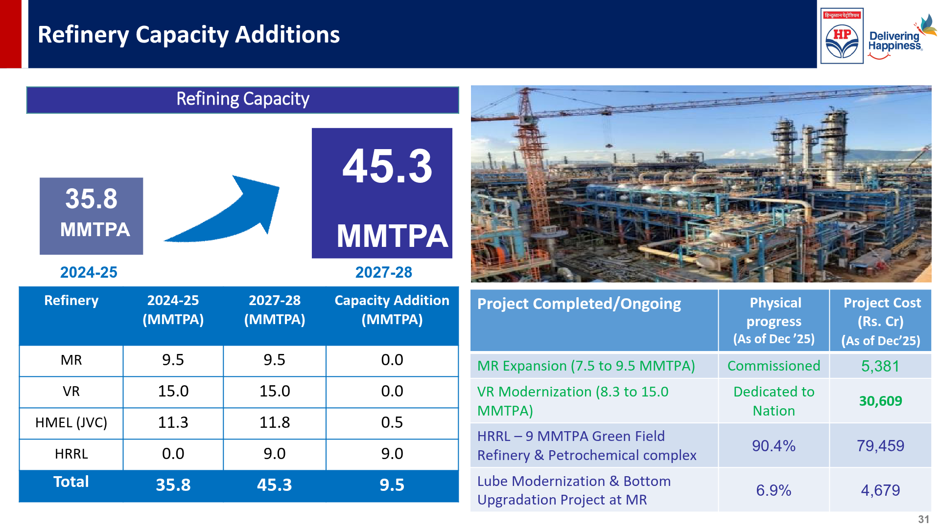 Operating refineries at 105-115% utilization indicates that HPCL has reached its internal production ceiling. Future earnings growth is now highly sensitive to global price spreads rather than further volume gains.