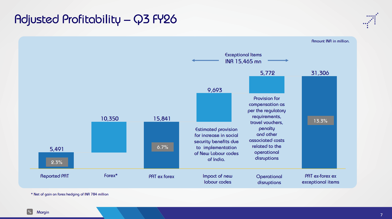 A big chunk of IndiGo’s weak headline profitability this quarter comes from exceptional items (~₹15.5 bn)—largely one-off provisions and disruption-related costs. Strip these out, and profits jump sharply, showing that the core business is far stronger than reported numbers suggest.
