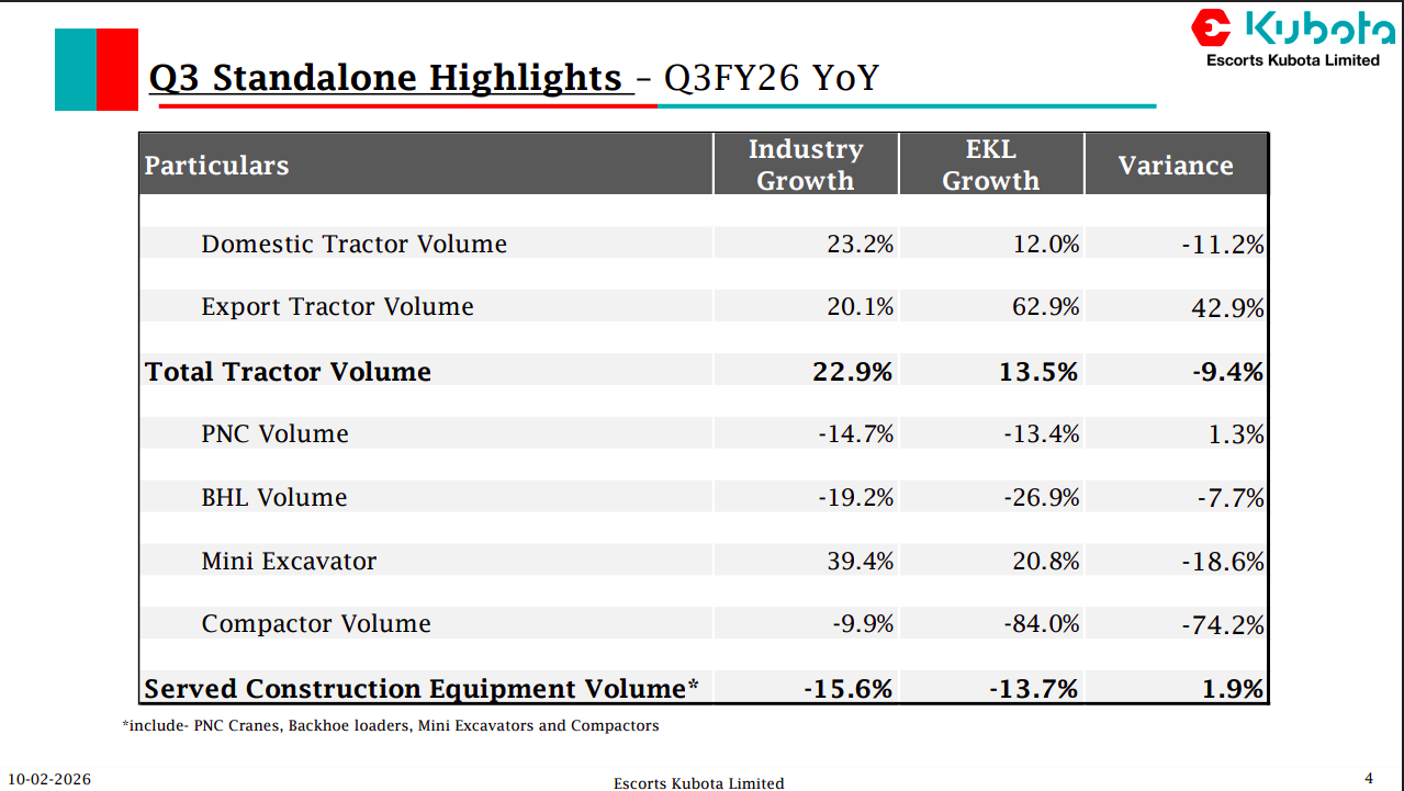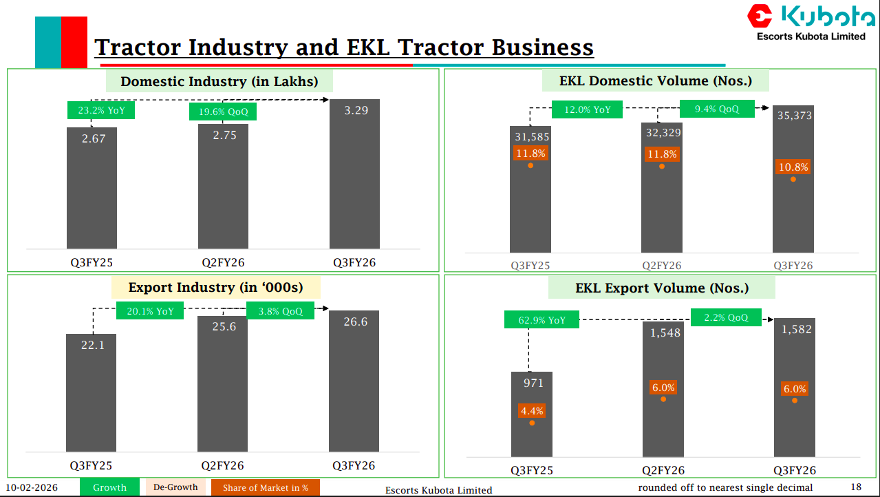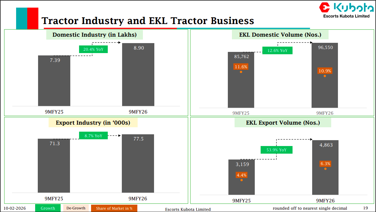 Domestic tractor industry saw strong growth (~20%+), while EKL grew at a slower pace, leading to market share moderation. Exports, however, were a key positive with strong double-digit growth for EKL.