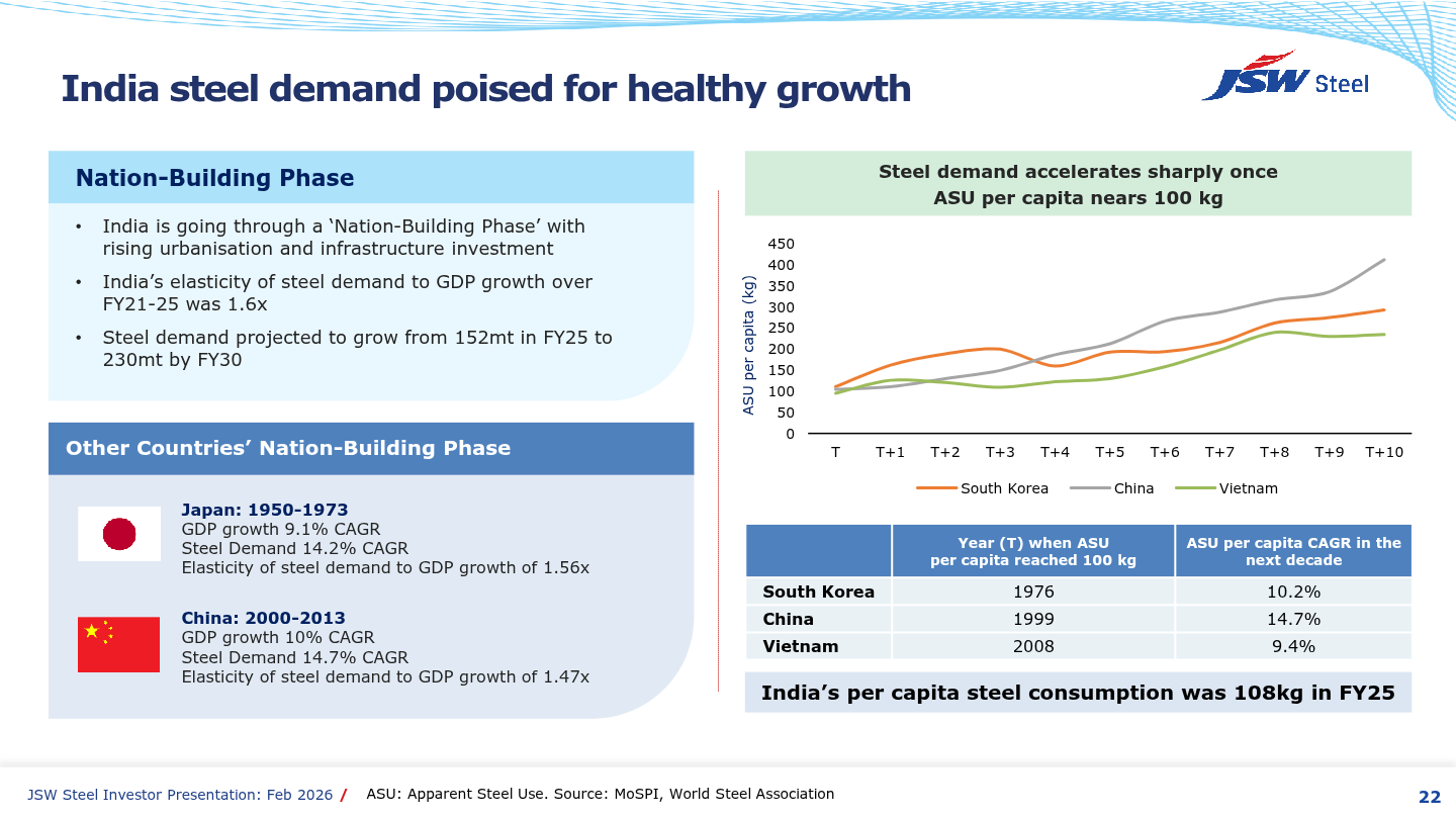 India crossing the 100kg per capita consumption threshold marks a structural pivot toward accelerated long-term domestic steel demand. This transition provides a durable volume growth runway that is less dependent on volatile global export markets.
