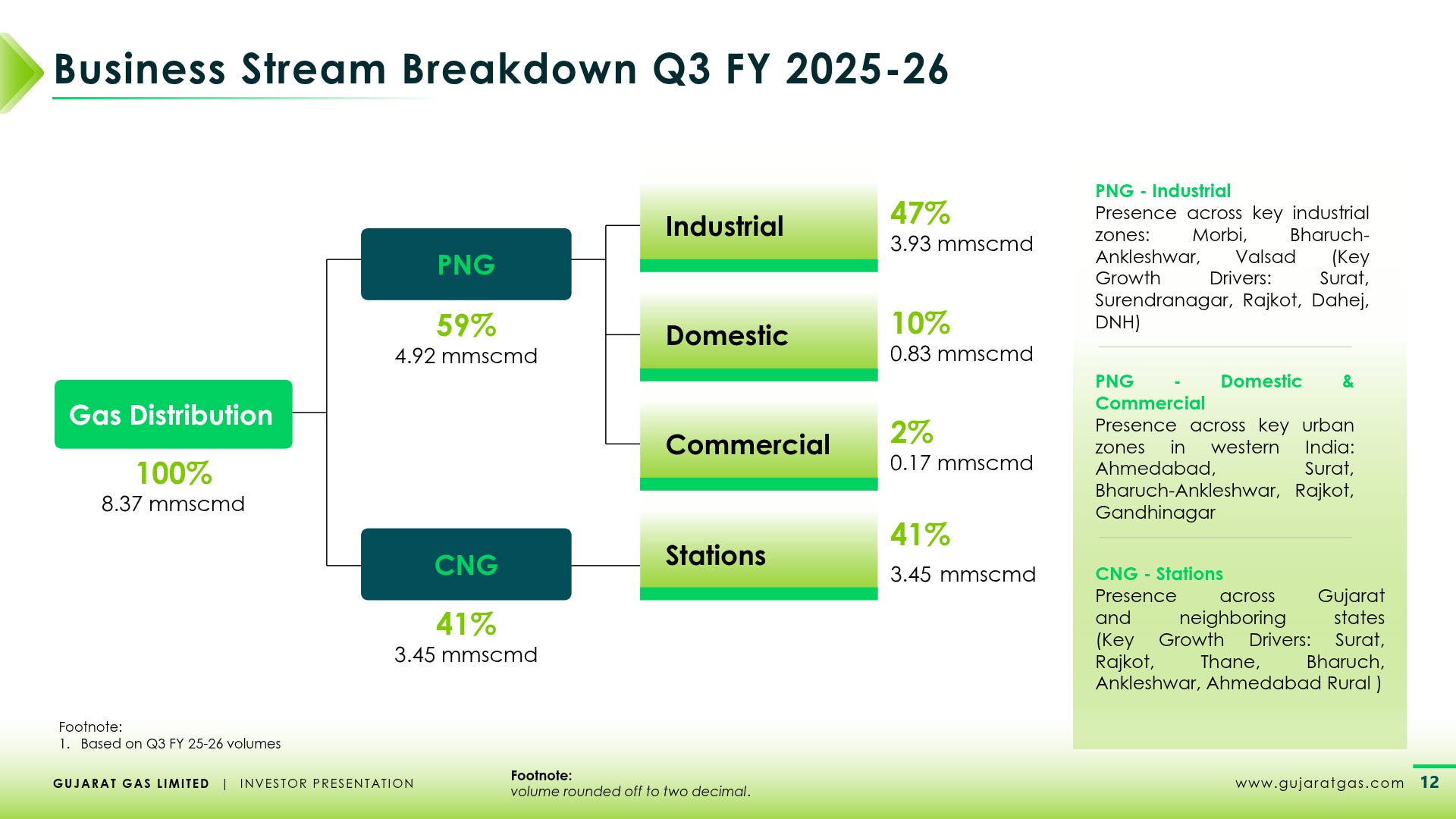 Gujarat Gas is India’s largest city gas distribution player, operating a vast network across 44 districts in multiple states. The company provides natural gas to industrial, domestic, and commercial segments while maintaining a dominant and expanding CNG station footprint.