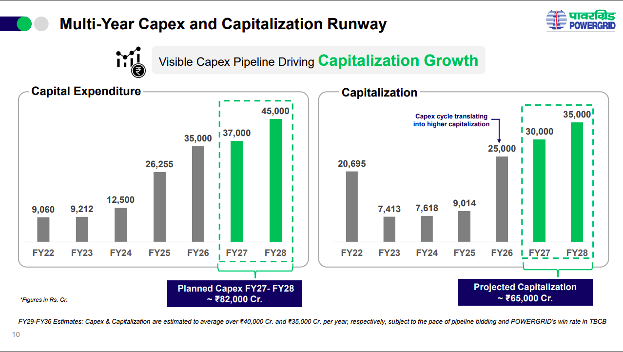 A clear capex ramp-up is underway (₹82,000 crore planned over FY27–28), which should translate into steady capitalization growth (~₹65,000 crore). This underpins earnings visibility given the regulated return model.