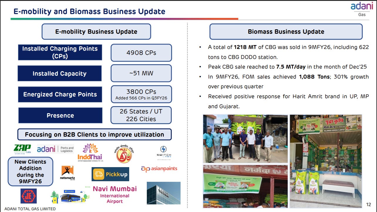 ATGL’s new energy bets are beginning to scale, with EV charging expanding to ~4,900 points across 226 cities and biomass seeing steady traction with rising CBG volumes and strong growth in FOM sales. The focus on B2B clients to improve utilization and early positive response to its bio-energy brand suggest these adjacencies are moving from pilot phase to meaningful contributors, supporting ATGL’s broader transition beyond traditional gas distribution.