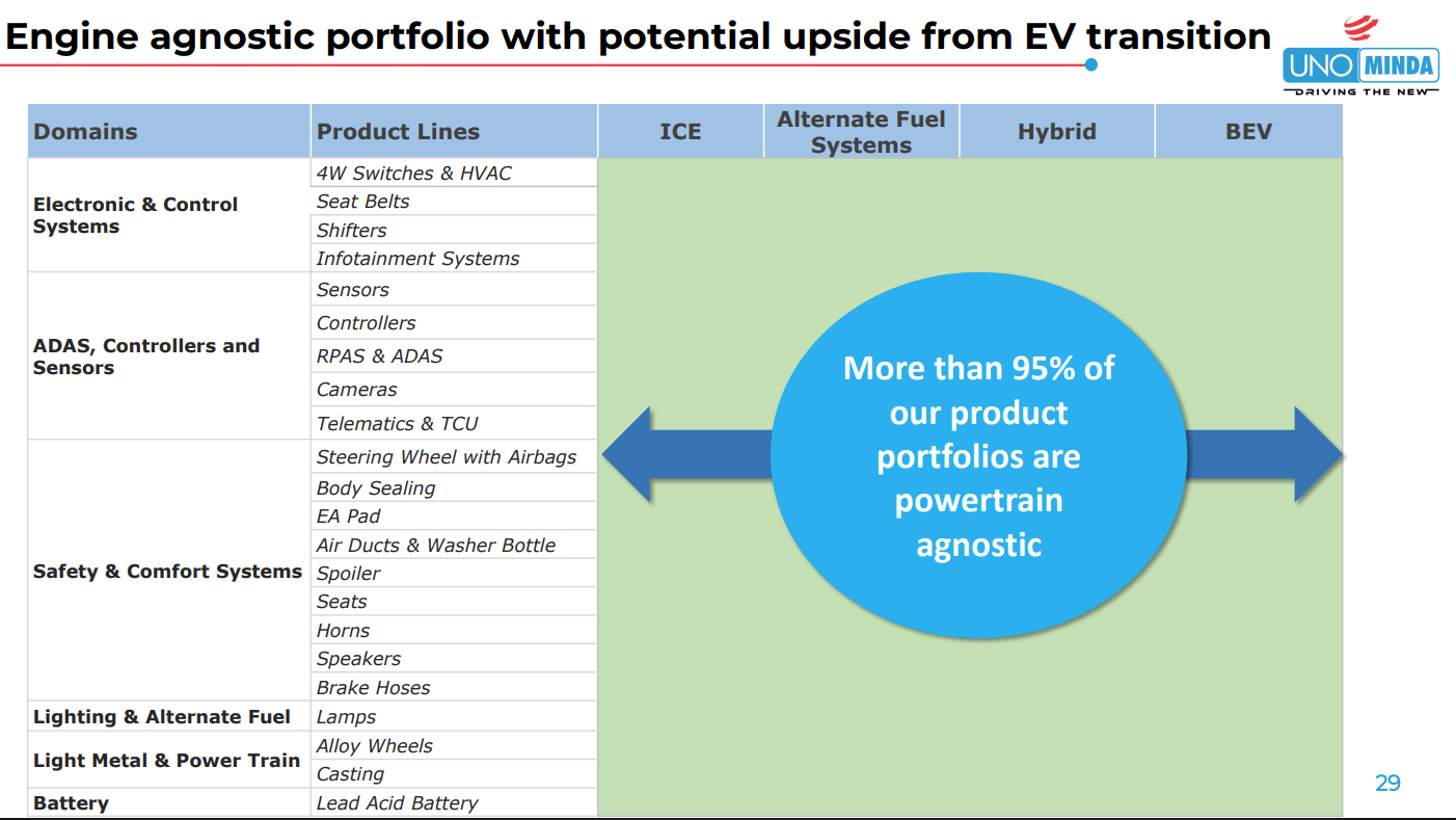 Uno Minda’s portfolio is largely powertrain-agnostic (>95%), meaning most of its products remain relevant across ICE, hybrid, and EV platforms—reducing disruption risk from the EV transition. This positions the company to ride the shift to electrification without needing a complete portfolio overhaul, while still benefiting from incremental EV-specific opportunities.