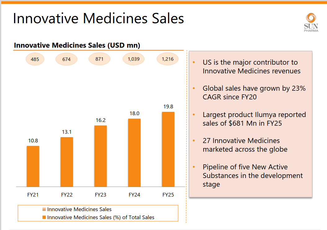 Innovative medicines are a key growth driver, with strong double-digit growth (~23% CAGR since FY20) and rising contribution to overall sales. The US remains the primary market, with Ilumya leading the portfolio and a healthy pipeline supporting future growth.