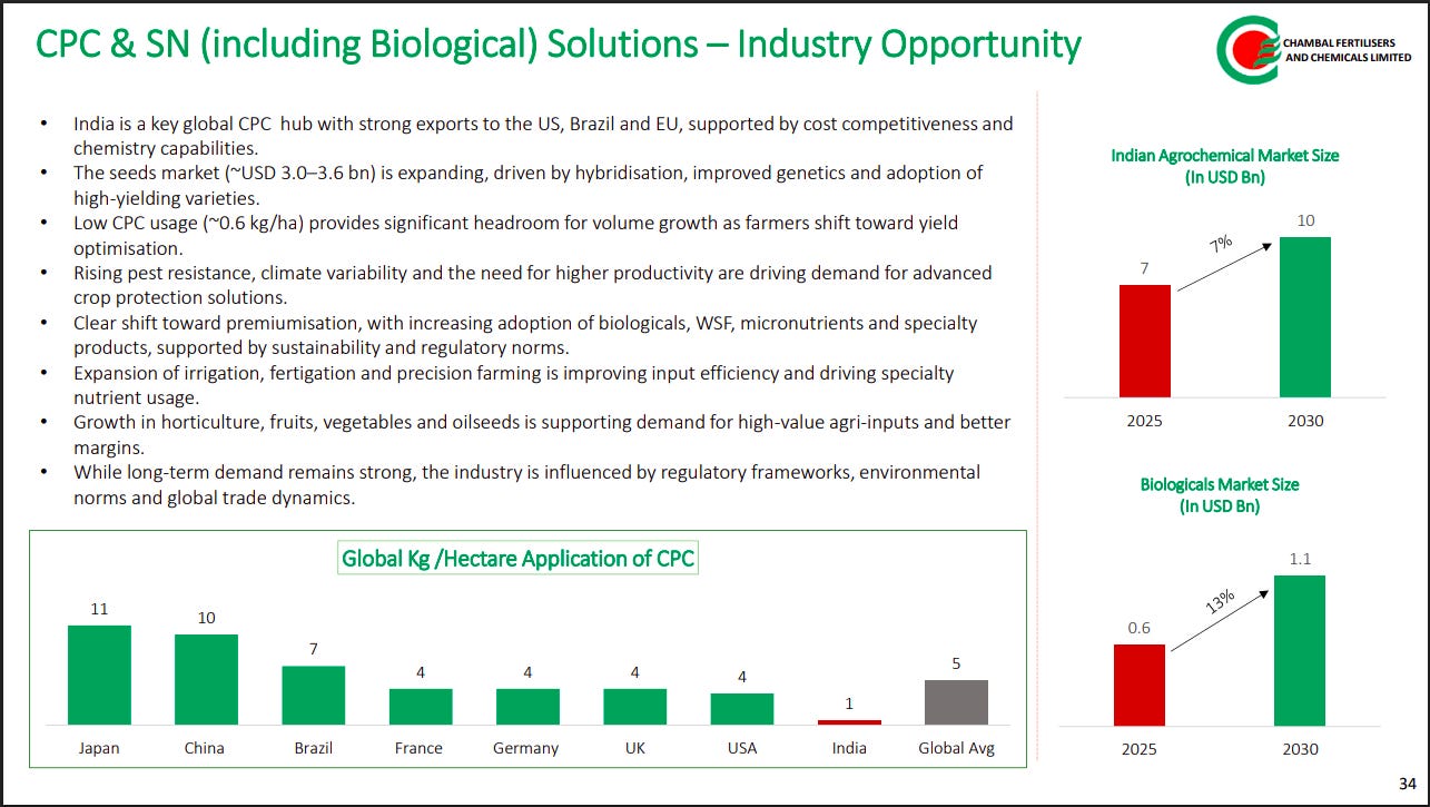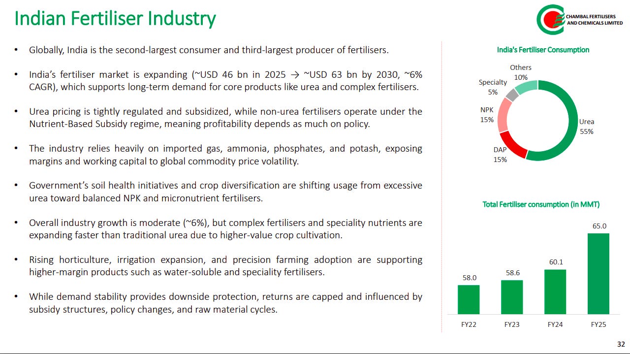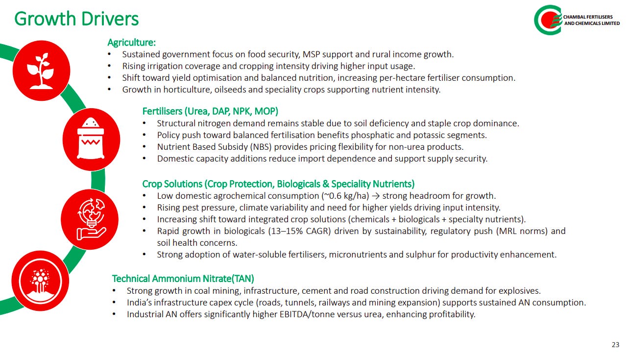 Fertiliser demand is structurally supported by food security focus, irrigation expansion, and shift toward balanced nutrition. Beyond urea, growth is increasingly coming from specialty nutrients, crop protection, and biologics, while TAN offers a high-margin industrial growth lever linked to infra and mining.