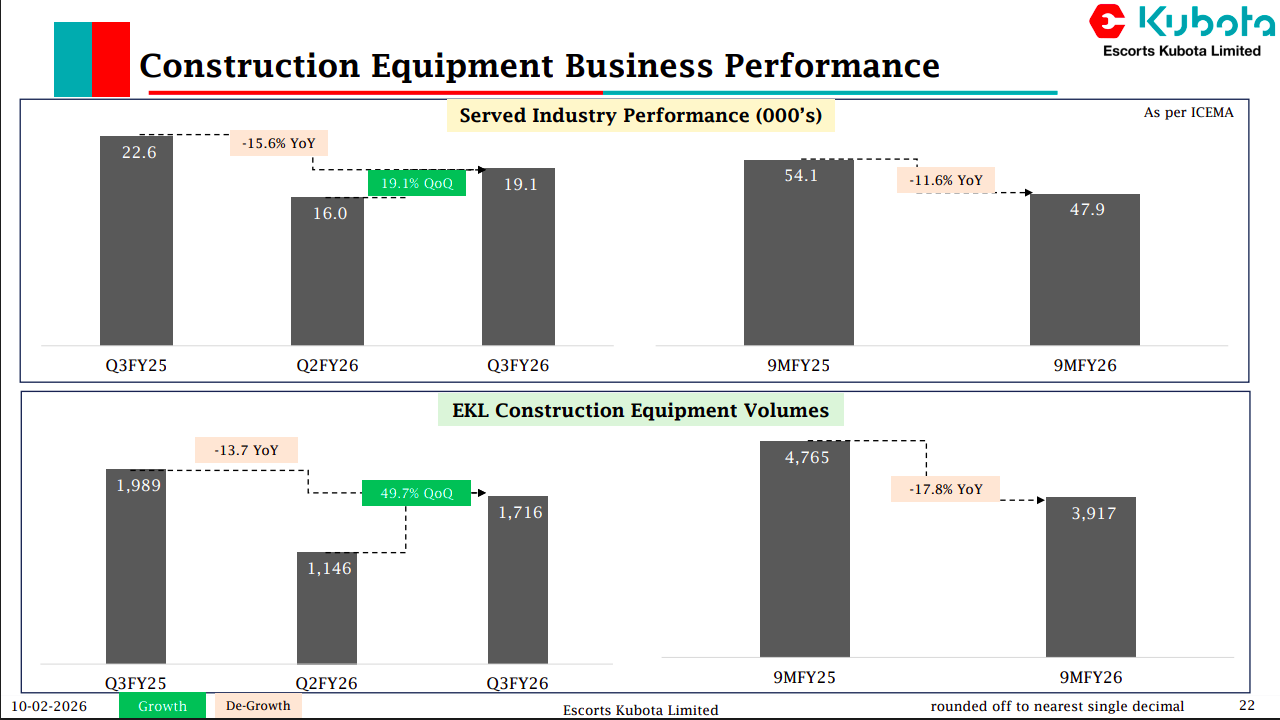 EKL underperformed the industry in domestic tractors but significantly outperformed in exports. Construction equipment segments remained weak overall, though declines were broadly in line with industry trends.