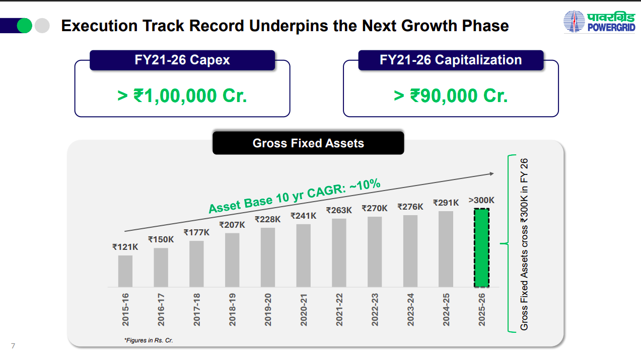 POWERGRID has compounded its asset base at ~10% CAGR over the last decade, with ₹1 lakh crore+ capex translating into ₹90,000+ crore capitalization. This reflects strong execution conversion and disciplined capital deployment.