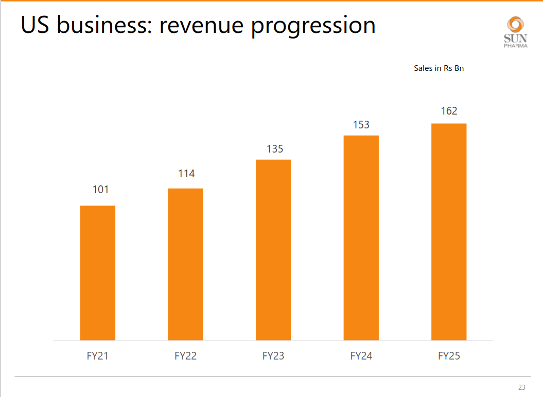 US revenues have grown steadily from ₹101 bn to ₹162 bn over FY21–FY25, reflecting strong execution in specialty and innovative products. This remains the company’s most important and consistent growth engine.