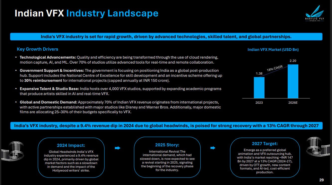 India’s VFX industry is poised for strong growth, supported by talent, cost advantage, and policy support, with ~13% CAGR expected through 2027. After a temporary dip in 2024, demand is recovering on the back of global content revival.