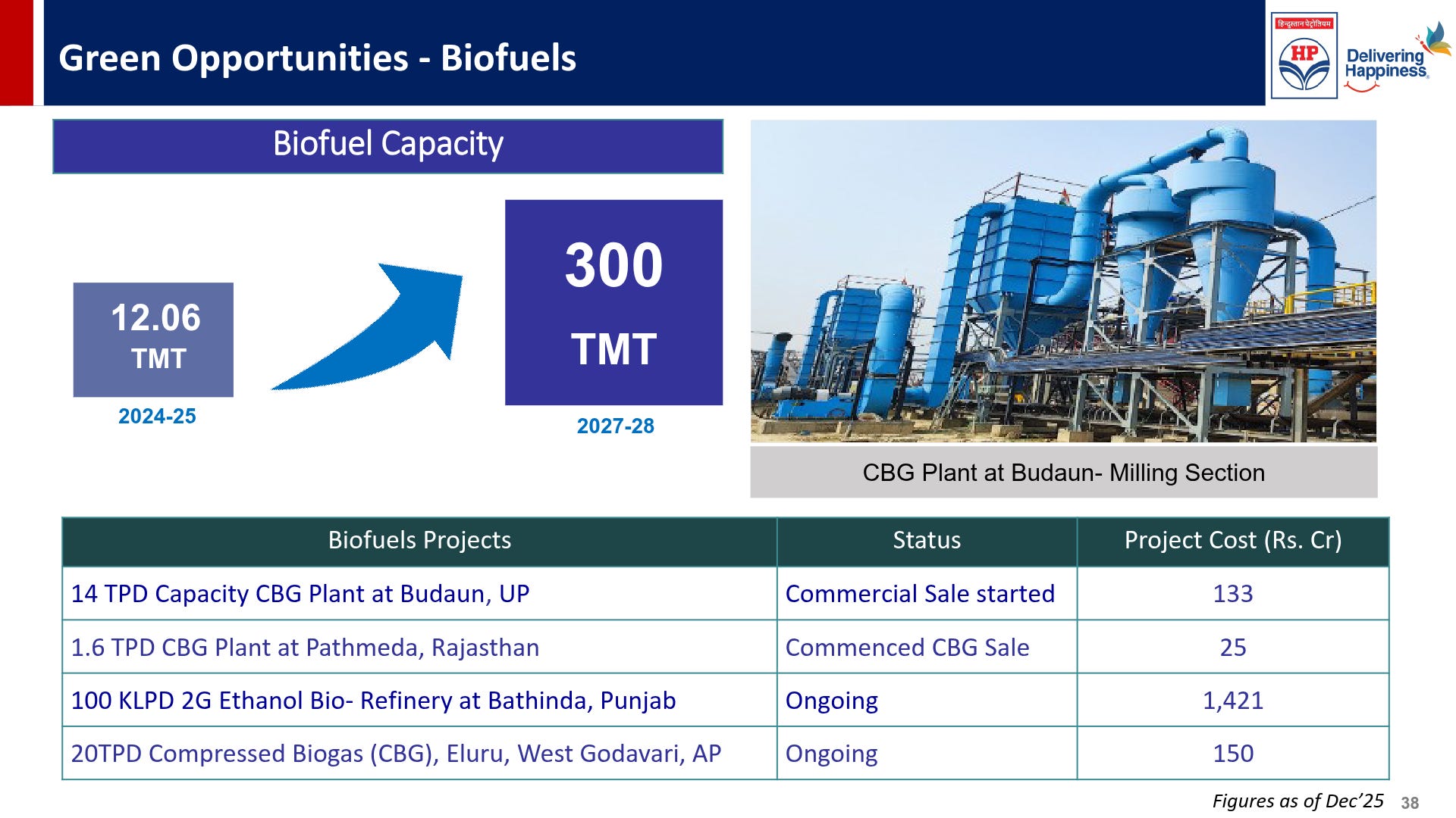 Expanding biofuel capacity to 300 TMT reflects a structural response to domestic blending mandates. Success in this segment is critical for protecting marketing margins as traditional fuel demand slows.