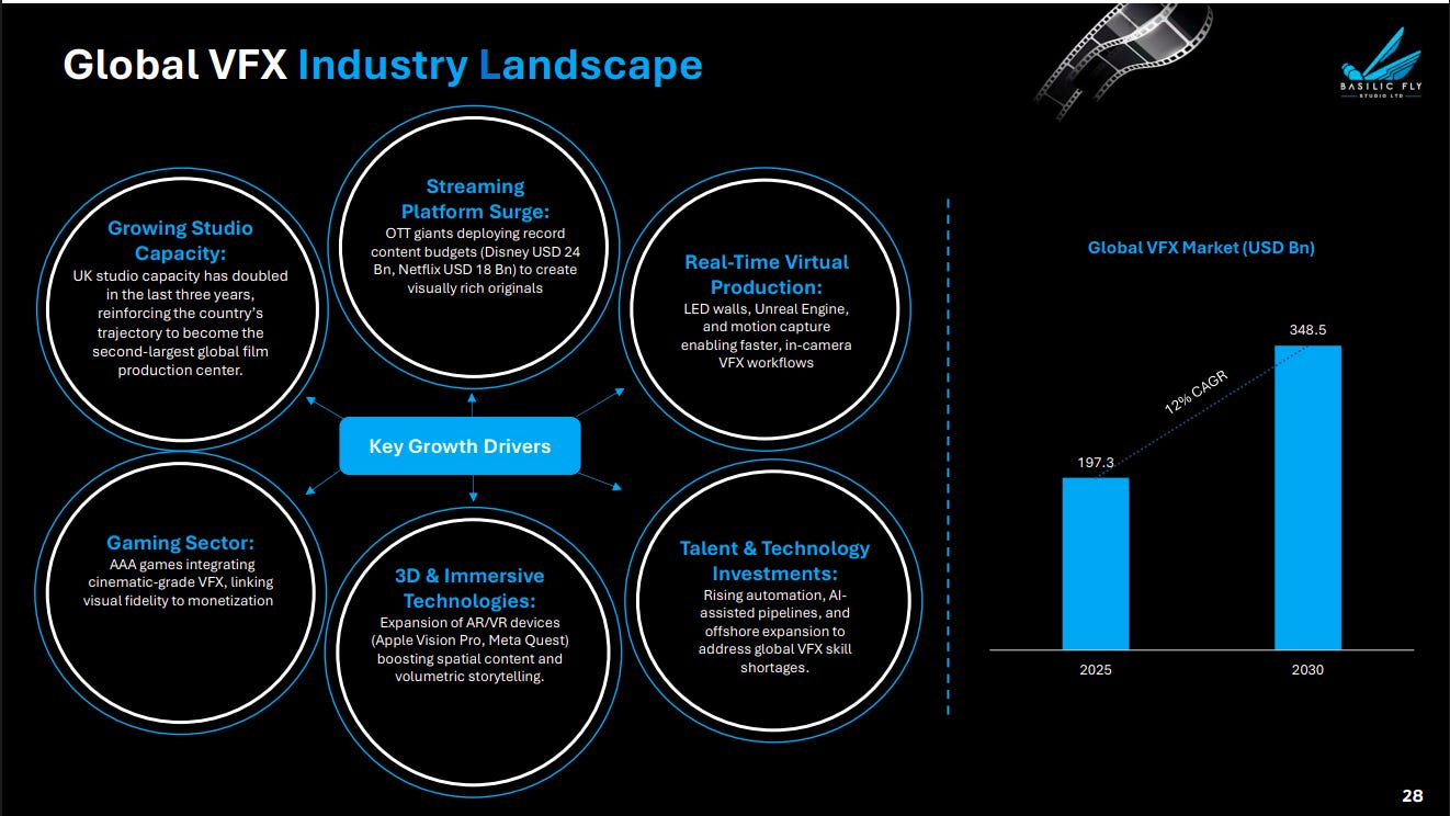 Global VFX demand is expanding rapidly, driven by OTT spending, gaming, real-time production, and immersive technologies. The market is expected to grow at ~12% CAGR, supported by rising content complexity and tech adoption.