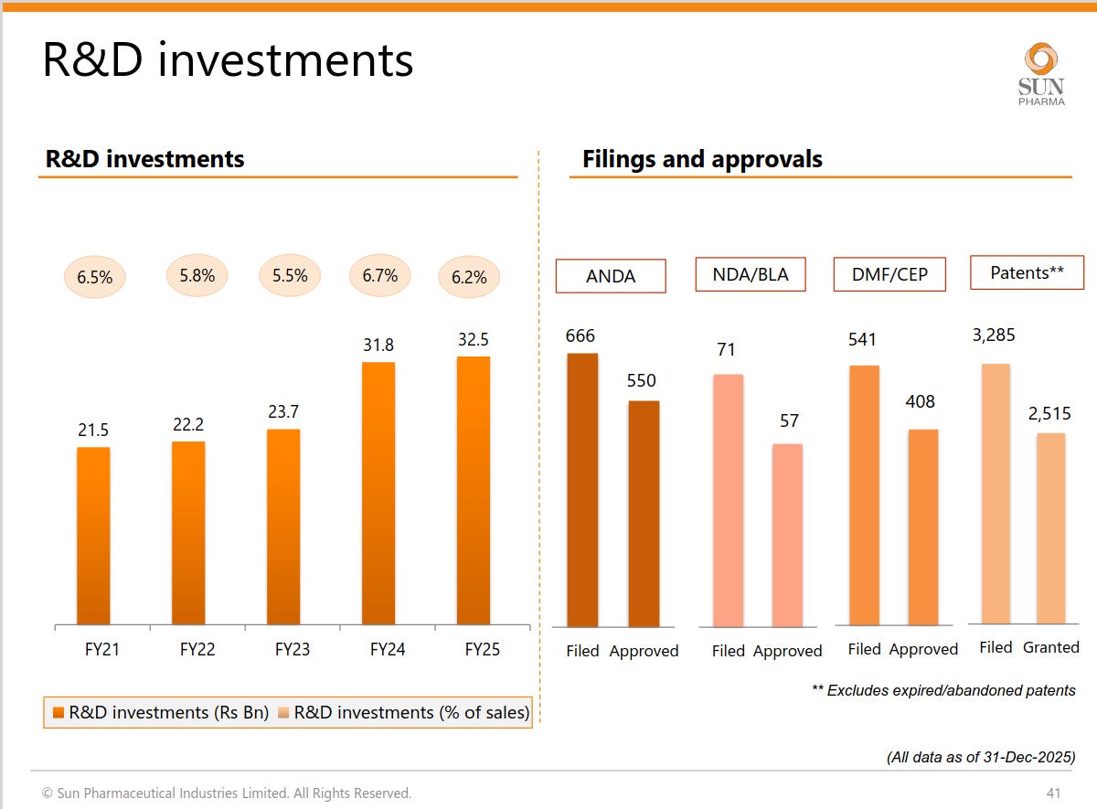 R&D spend has steadily increased to over ₹32 bn, maintaining ~6% of sales, indicating continued focus on innovation. A strong pipeline of filings, approvals, and patents supports long-term product launches and growth visibility.