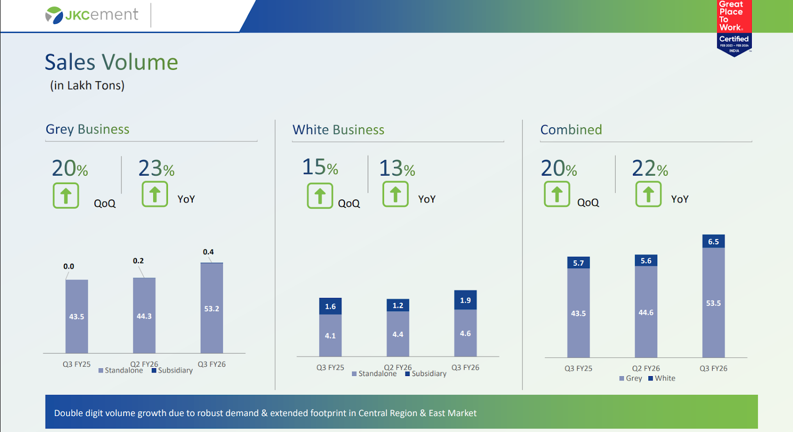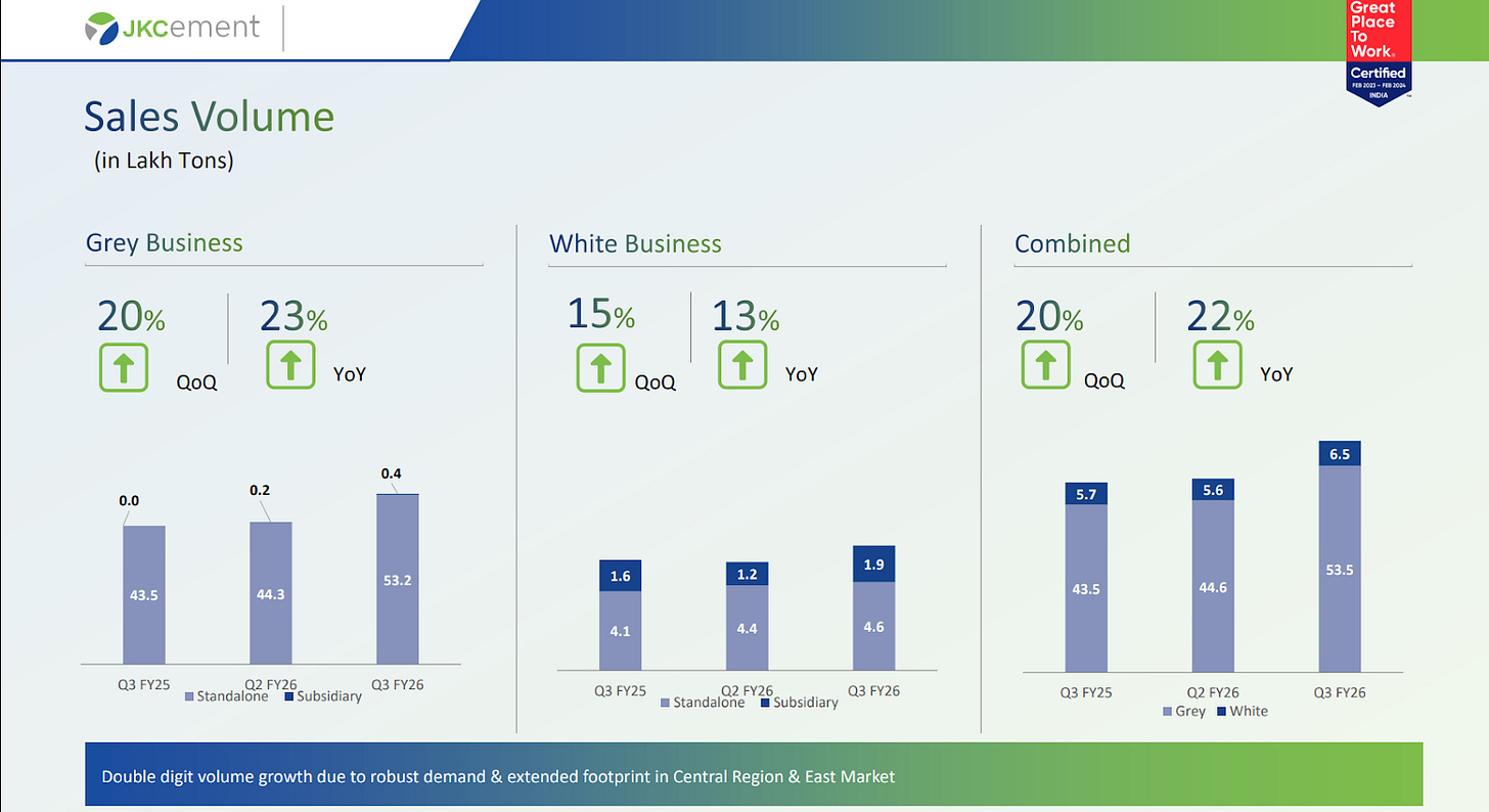 JK Cement is seeing broad-based volume growth across both grey and white cement segments, with grey cement continuing to drive the bulk of volumes and growth (strong double-digit YoY), while the white cement business, though smaller, is also scaling steadily. This highlights a balanced portfolio where grey provides scale and demand-led growth, and white adds niche, higher-value expansion.