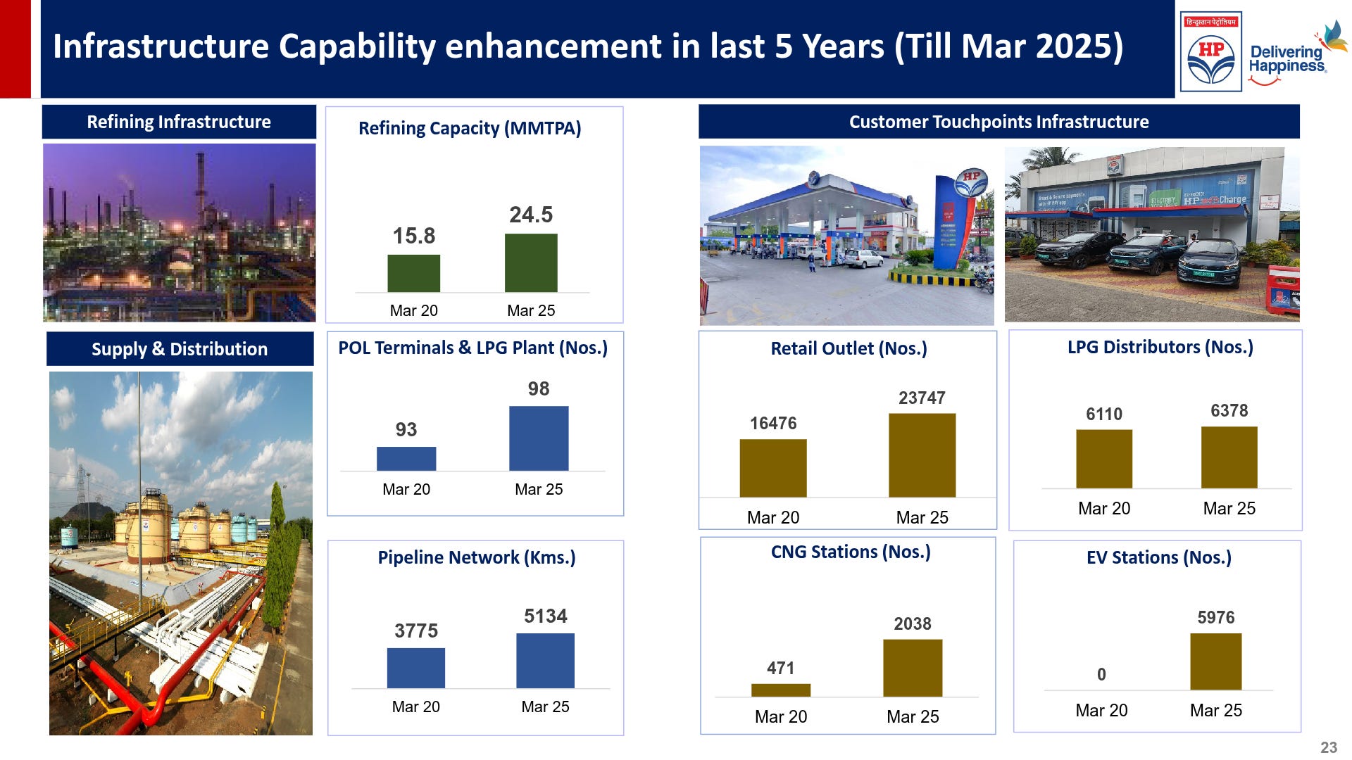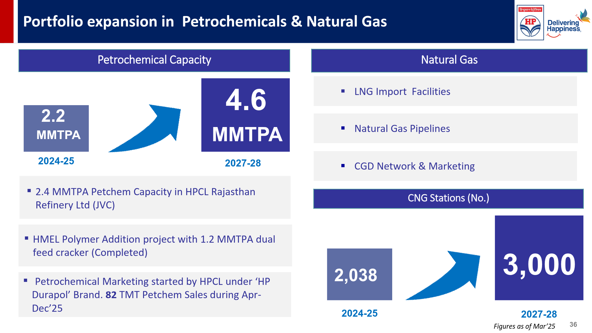 Rapidly scaling CNG and EV charging stations ensures HPCL retains its retail dominance as consumer mobility patterns shift. This infrastructure pivot hedges against long-term demand risks for traditional petrol and diesel.