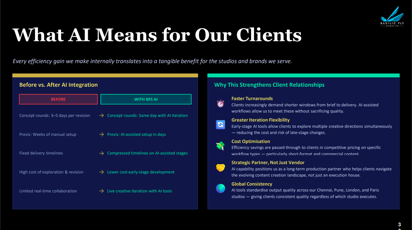 AI significantly compresses timelines, lowers costs, and enables faster creative iteration. This strengthens client relationships by improving efficiency, consistency, and positioning the company as a long-term strategic partner.