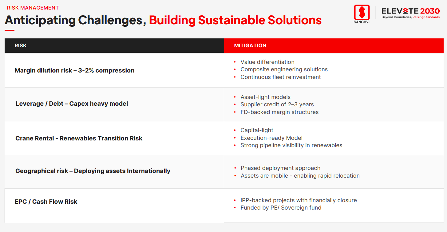 Key risks remain around margin compression, leverage, and execution volatility, but the model is evolving toward asset-light structures, differentiated offerings, and better project visibility. Importantly, cash flow risk is mitigated through financially closed projects and institutional counterparties.