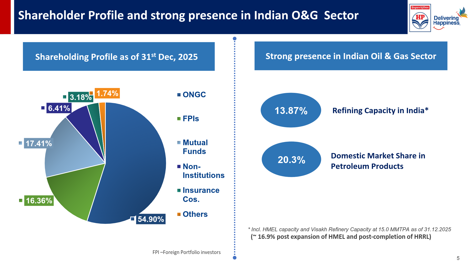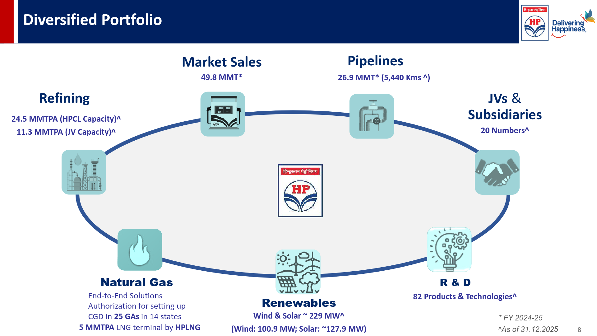HPCL is a leading Indian Maharatna central public sector enterprise operating large-scale refineries and a massive fuel marketing network. The company maintains a significant share in domestic petroleum product sales and is actively diversifying into natural gas and renewable energy.