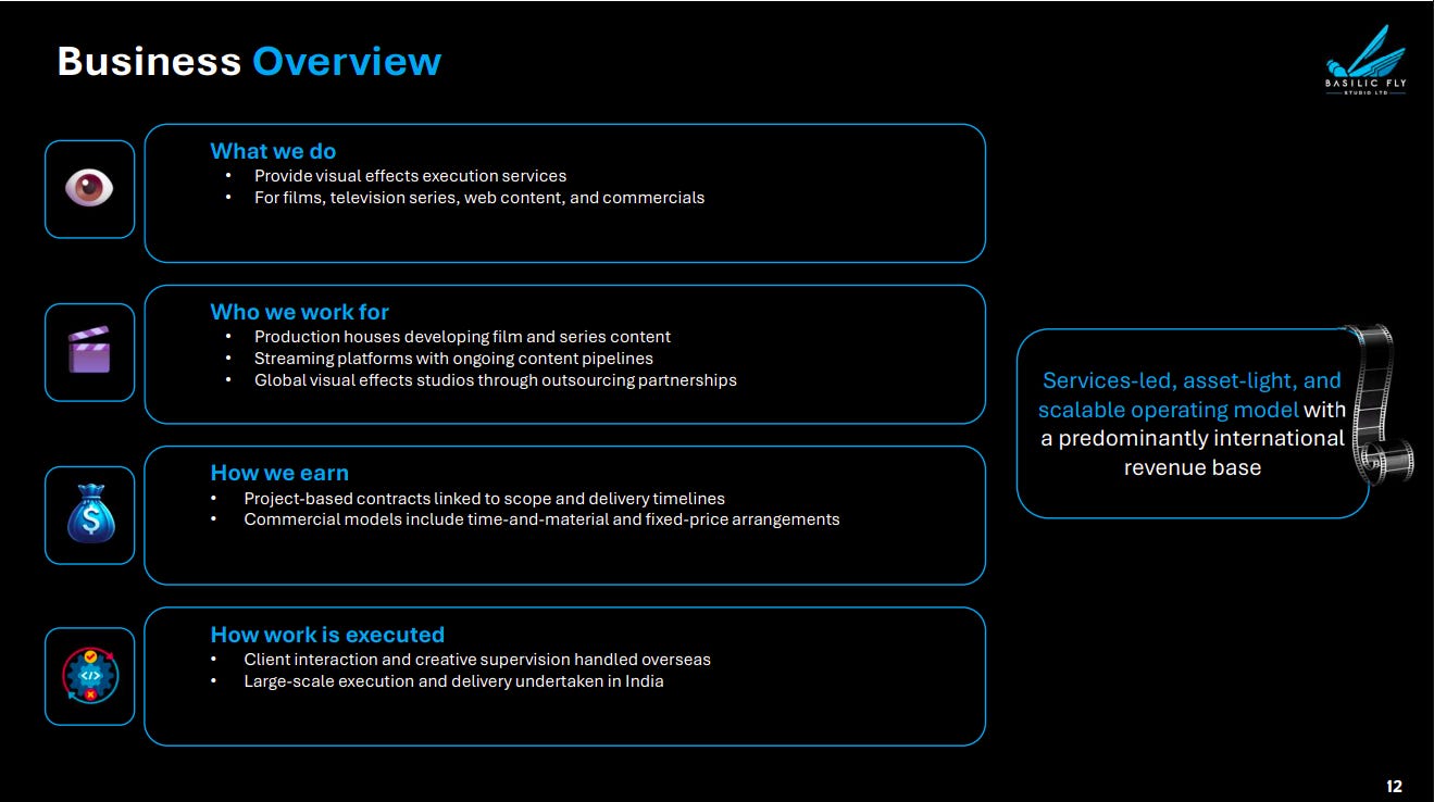 A services-led VFX company focused on execution for films, OTT, and commercials, with an asset-light and scalable model. Revenue is largely international, with creative work handled overseas and execution delivered from India.