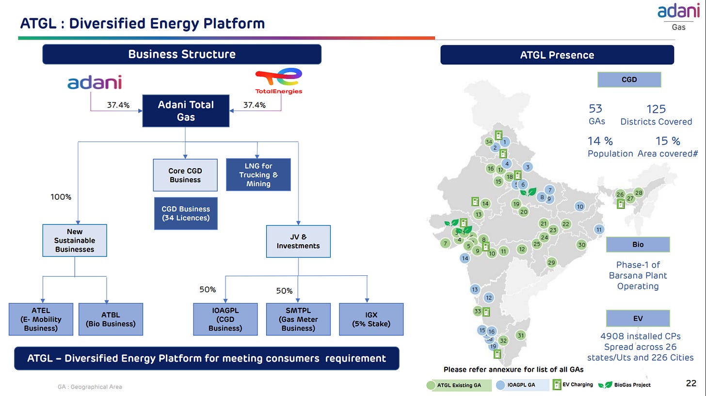 Adani Total Gas is positioning itself as more than just a city gas distributor—evolving into a diversified energy platform spanning core CGD, LNG, EV charging, and bio energy. While the core CGD business (34 licenses across 53 GAs) remains the backbone, the structure shows a clear push into adjacencies through JVs and new-age businesses, signalling a broader play on India’s energy transition rather than a pure gas utility story.