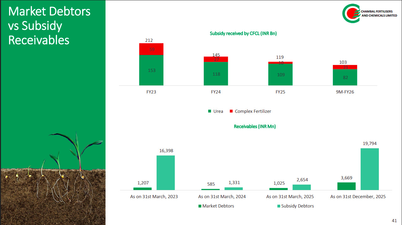 Subsidy receivables remain a core working capital swing factor, with improving trends but still elevated levels. While payouts are stabilising, cash flow visibility in fertilisers continues to be policy-dependent rather than purely operational.