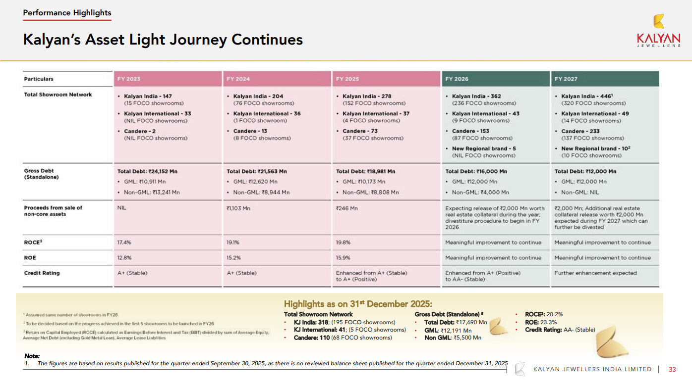 Kalyan’s expansion is increasingly being driven by an asset-light FOCO model, allowing it to scale its showroom network rapidly (especially via Candere and new formats) while bringing down debt and improving return ratios. The shift is visible in rising ROCE/ROE and declining standalone debt, indicating that growth is becoming more capital-efficient rather than balance-sheet heavy.