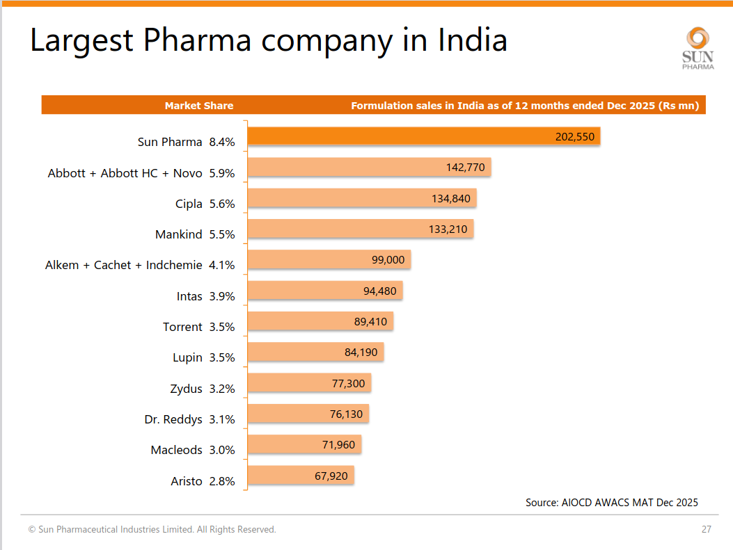 Sun Pharma leads the Indian pharma market with a clear gap over peers, driven by scale, strong domestic formulations business, and wide portfolio reach. Its leadership position reinforces pricing power and distribution strength.