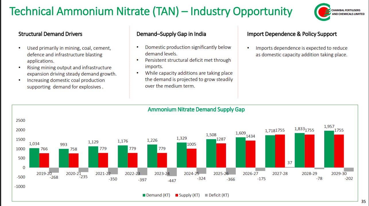 TAN demand is driven by mining, infrastructure and explosives, with a persistent domestic supply deficit. Capacity additions may reduce imports, but structurally this remains a tight, high-margin segment with strong volume visibility.