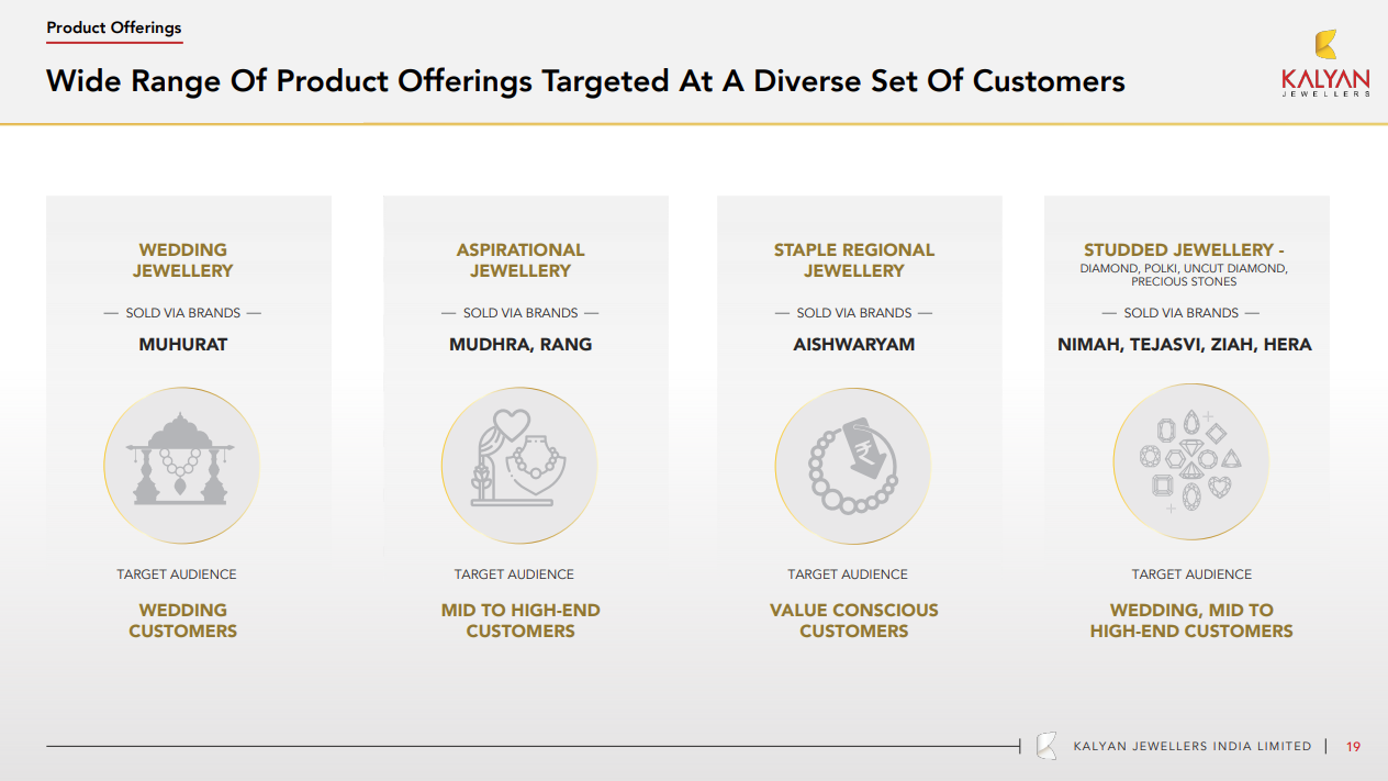 Kalyan is building a multi-brand, multi-product portfolio to cater to distinct customer segments—from wedding-focused collections (Muhurat) to aspirational (Mudhra, Rang), regional staples (Aishwaryam), and studded jewellery (Nimah, Tejasvi, Ziah, Hera). This segmentation allows it to target diverse price points and occasions, widening its addressable market while strengthening relevance across both premium and value-conscious customers.