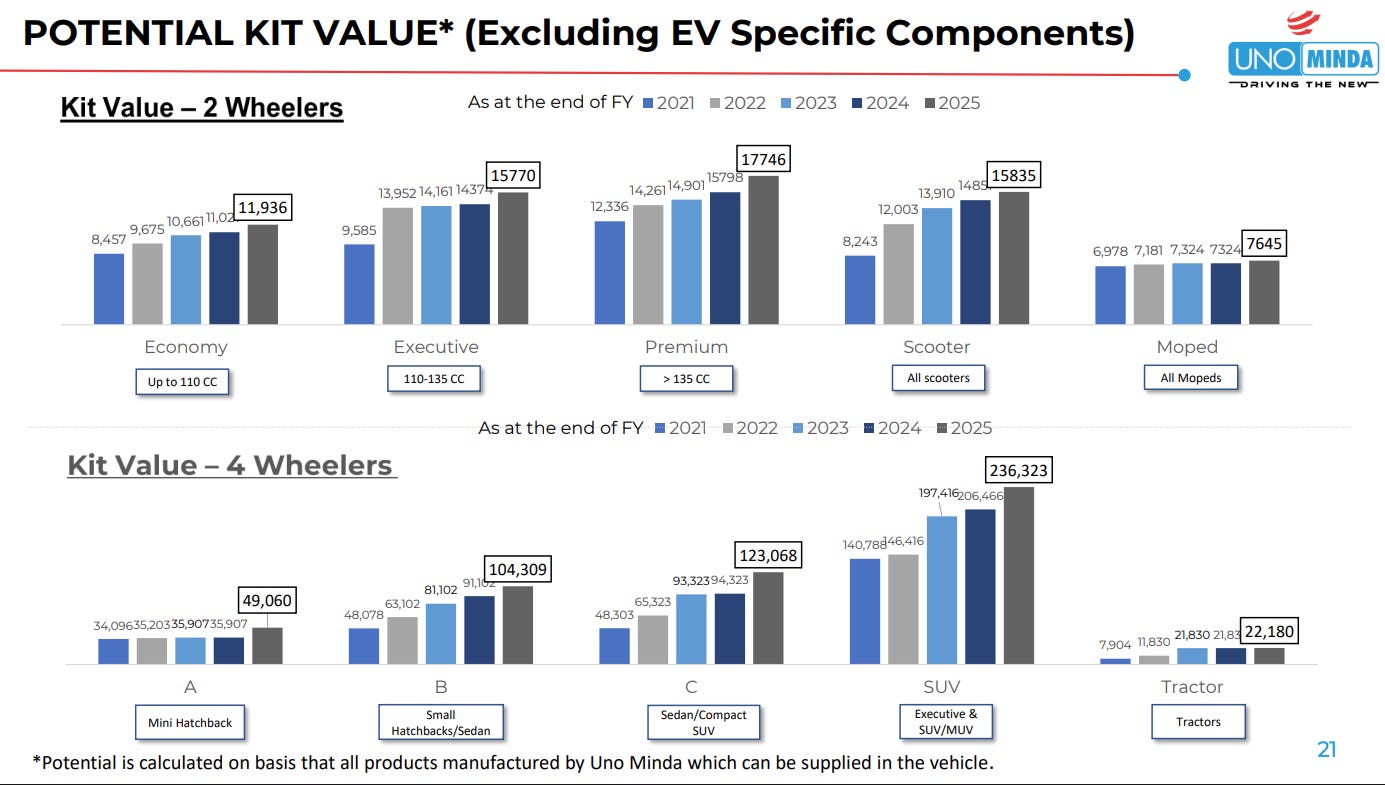 Uno Minda’s content per vehicle continues to rise across segments, with kit values steadily increasing in both 2Ws and 4Ws, especially in premium motorcycles and SUVs. This reflects a clear shift towards premiumization and higher feature intensity, allowing the company to capture more value per vehicle even without relying on EV-specific components.