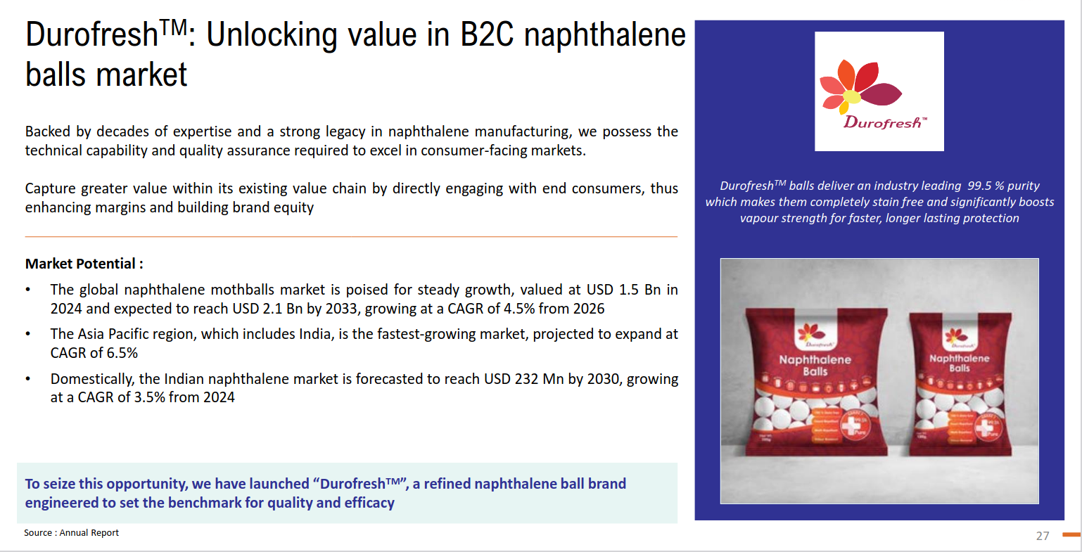 Durofresh™ marks a strategic move into the consumer naphthalene market, leveraging legacy manufacturing strength to capture higher margins. The brand targets steady domestic and global market growth while building direct consumer engagement and brand equity.