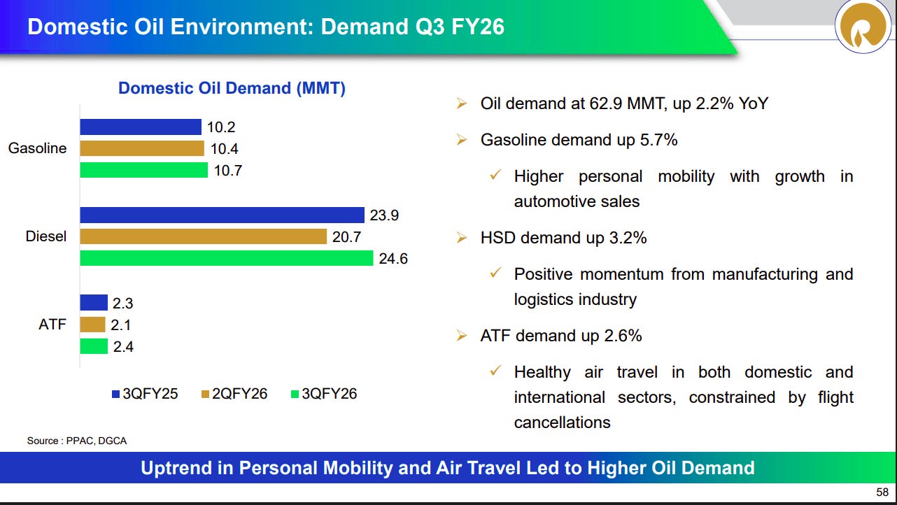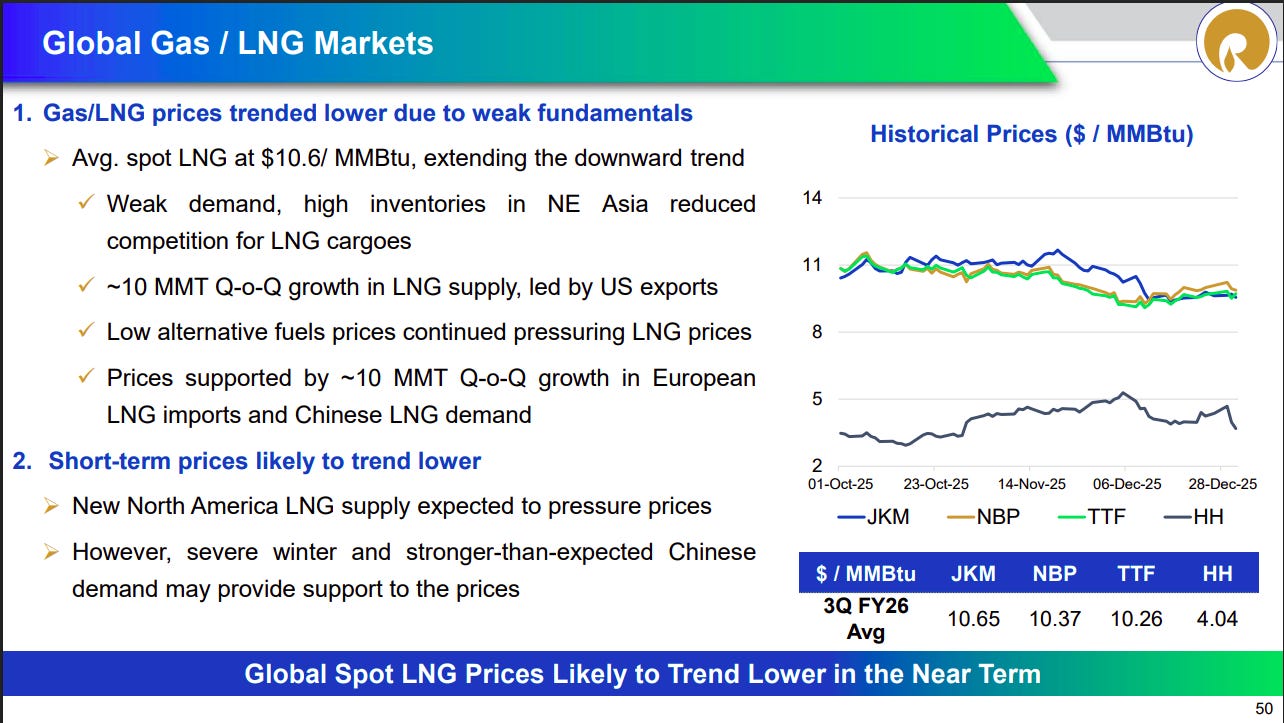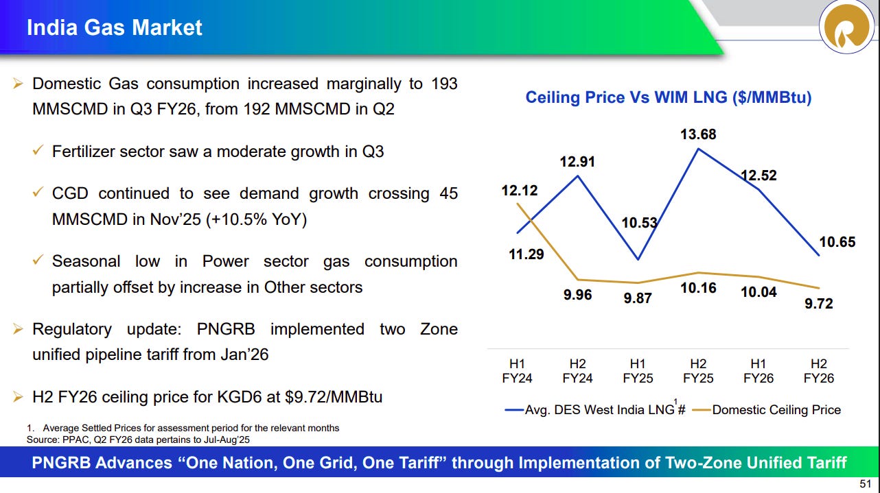 Domestic gas consumption edged up to 193 MMSCMD in Q3 FY26, supported by fertilizer demand and strong CGD growth. Power sector softness was offset by other segments, while regulatory moves toward unified pipeline tariffs aim to improve market efficiency.