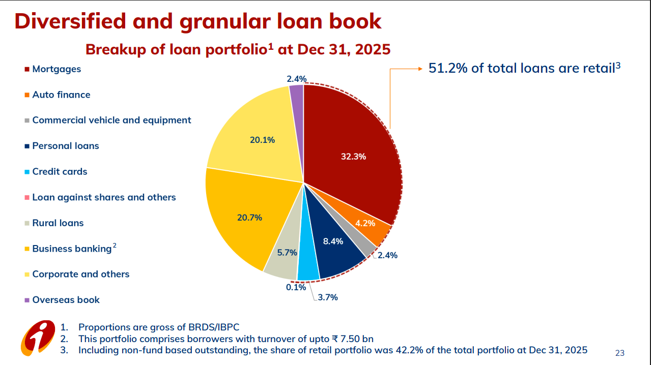 The loan book is well diversified, with retail loans accounting for 51.2% of total advances, led by mortgages, business banking, and corporate lending. Granularity across products and segments helps balance growth with risk stability.